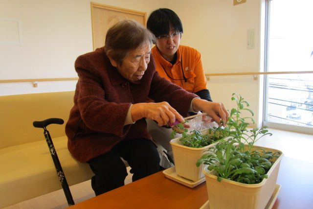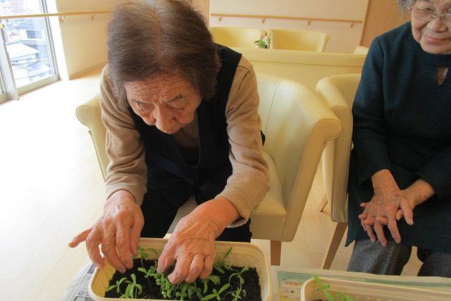 Kさまとお話をしている中で、「昔は季節に応じた野菜を育てとったんよ。夏はトマトやキュウリ。冬は白菜。あれもこれも色々植えとったよ」と、自宅で野菜や花を育てていたことを活き活きと話してくださったことがありました。それならば、野菜を育てていただこうと共有部で春菊を育てていただくことにしました。