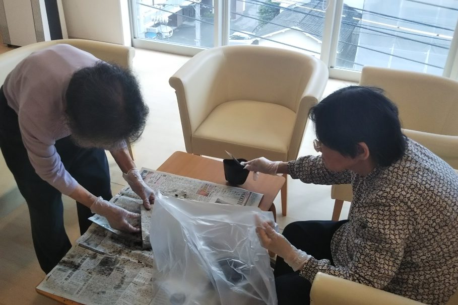 ソワソワと心が落ち着かないご入居者も、テーブルに新聞紙を敷き、準備を始めると