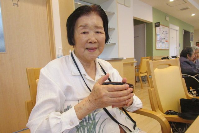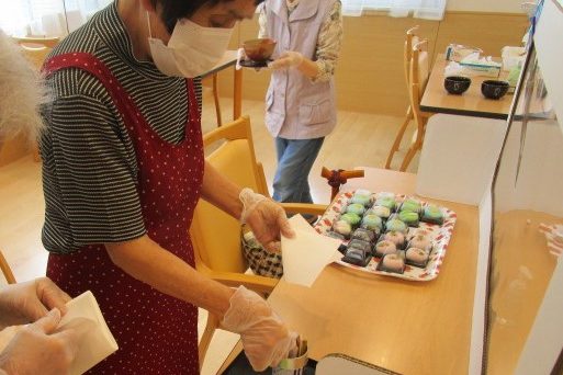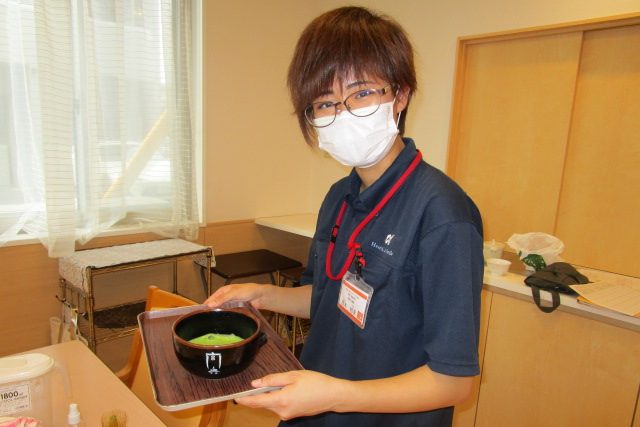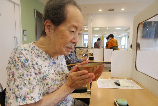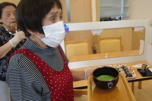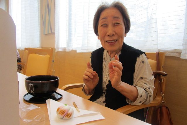 張り切ってエプロンを持参され、お抹茶や和菓子を配られる方や、手際よくお茶をたててくださる方もいらっしゃり、普段の生活では見ることが出来ないご入居者のお姿にスタッフ一同驚かされるばかりでした。