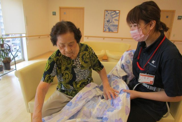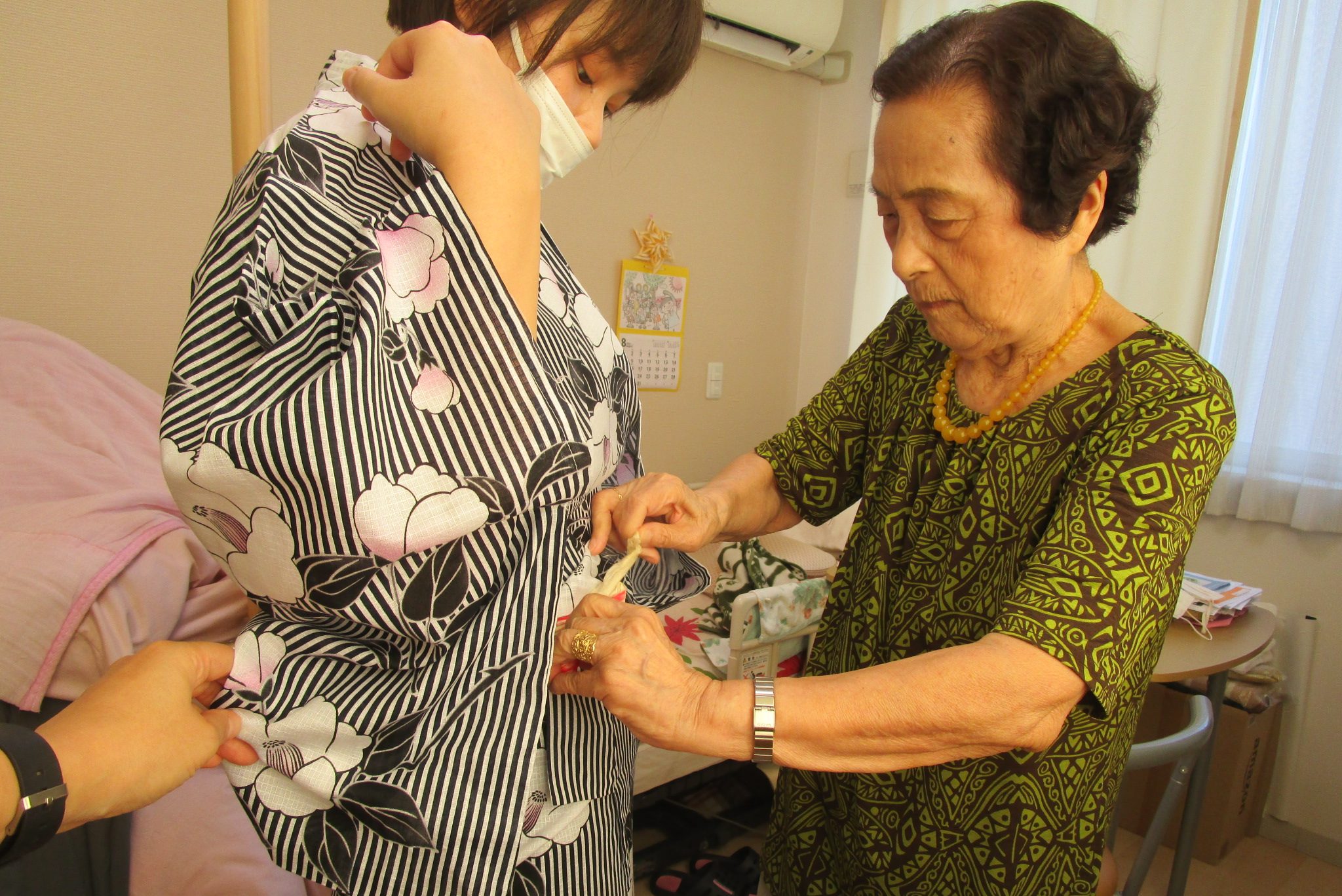 当日は、手に力が入らないことを最後まで気にされていましたが、真剣な眼差しで、スタッフと共に浴衣の着付けを行い、日頃より仲良くされているご入居者にも「えかろ~!かわいいじゃろう~!」とお披露目をされました。