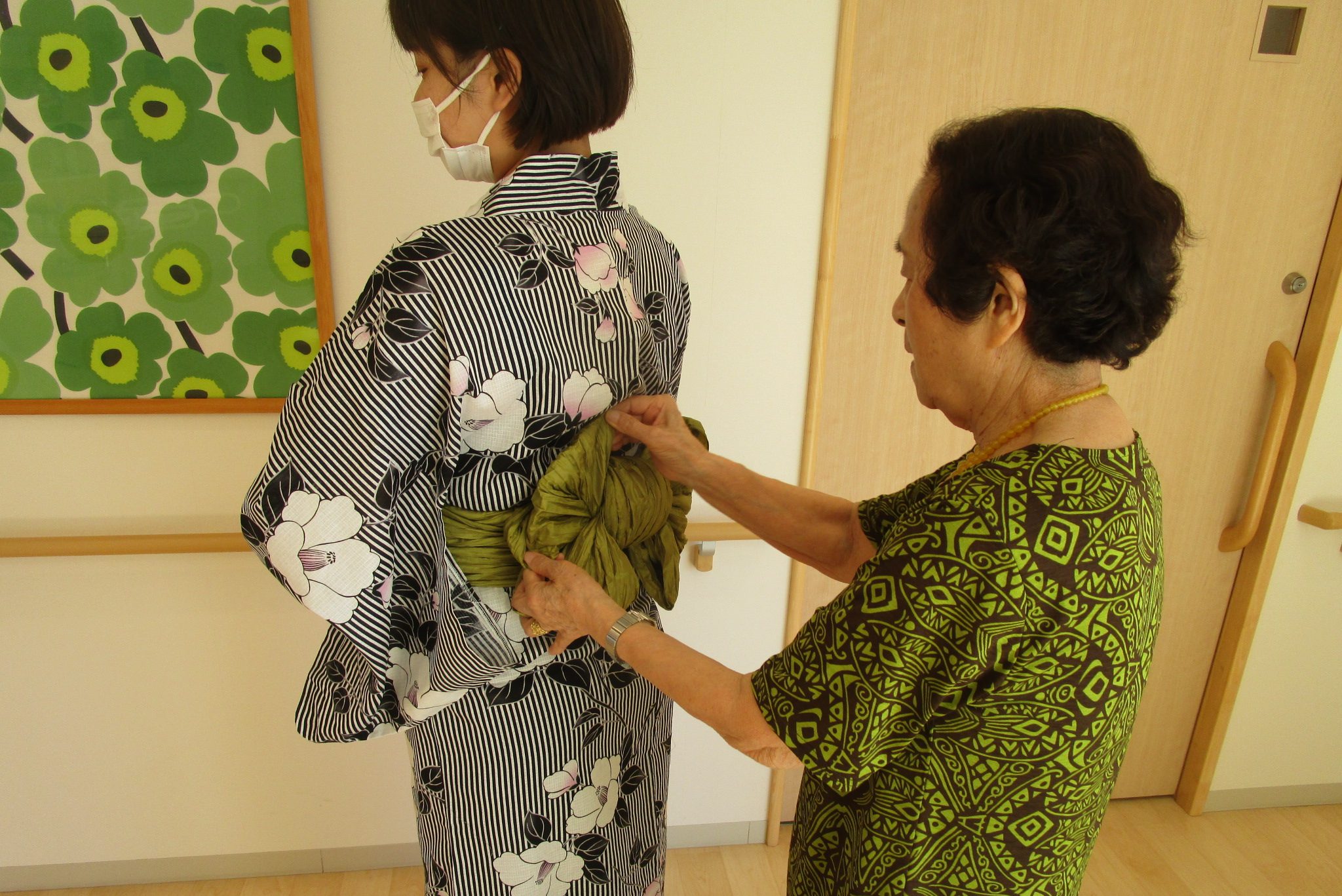 先日、着付けの先生をされていたご入居者のYさまに、浴衣の着つけをしていただきました。