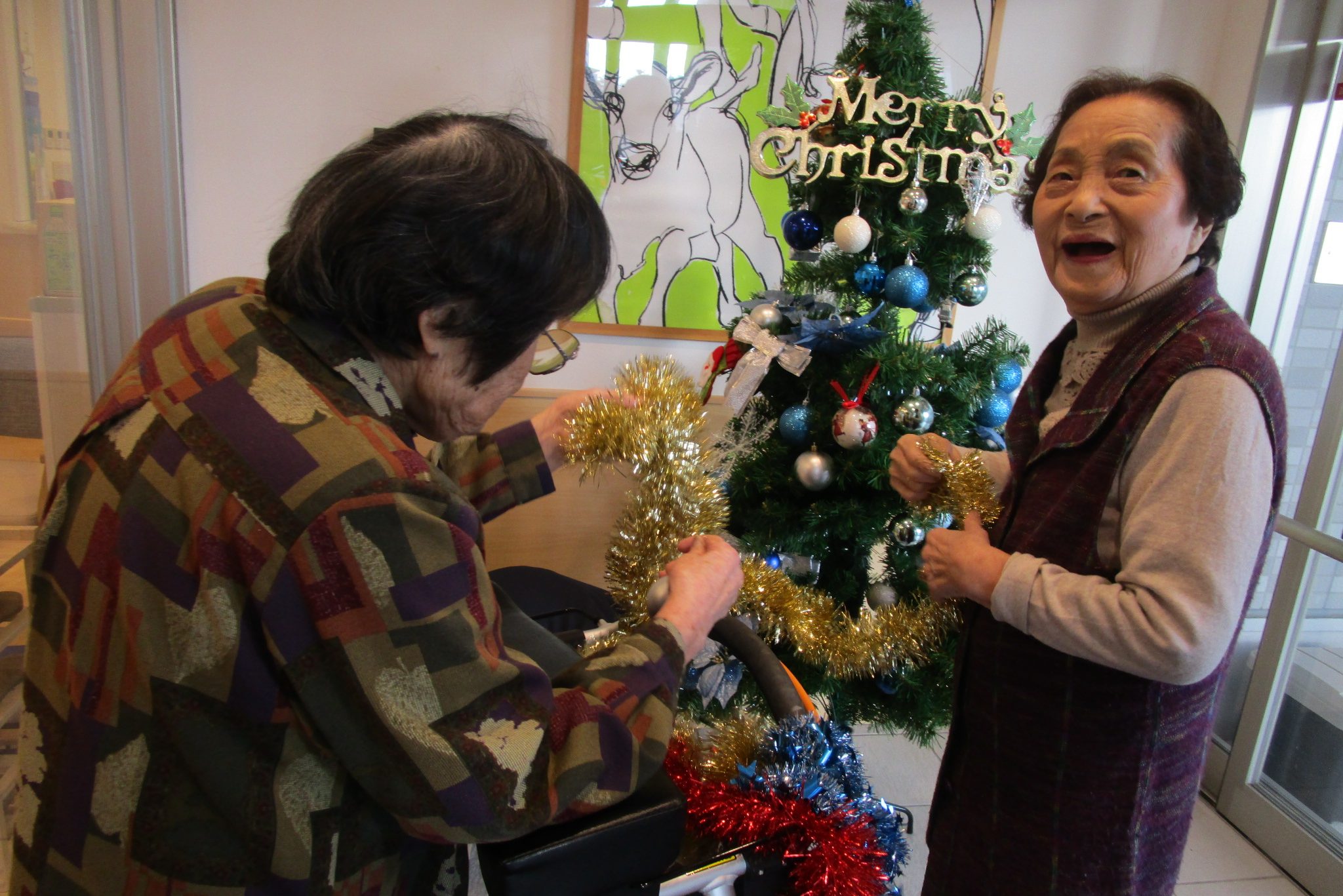 ツリーを2本用意し、ご入居者とレッツクリスマスツリーの飾りつけ!
