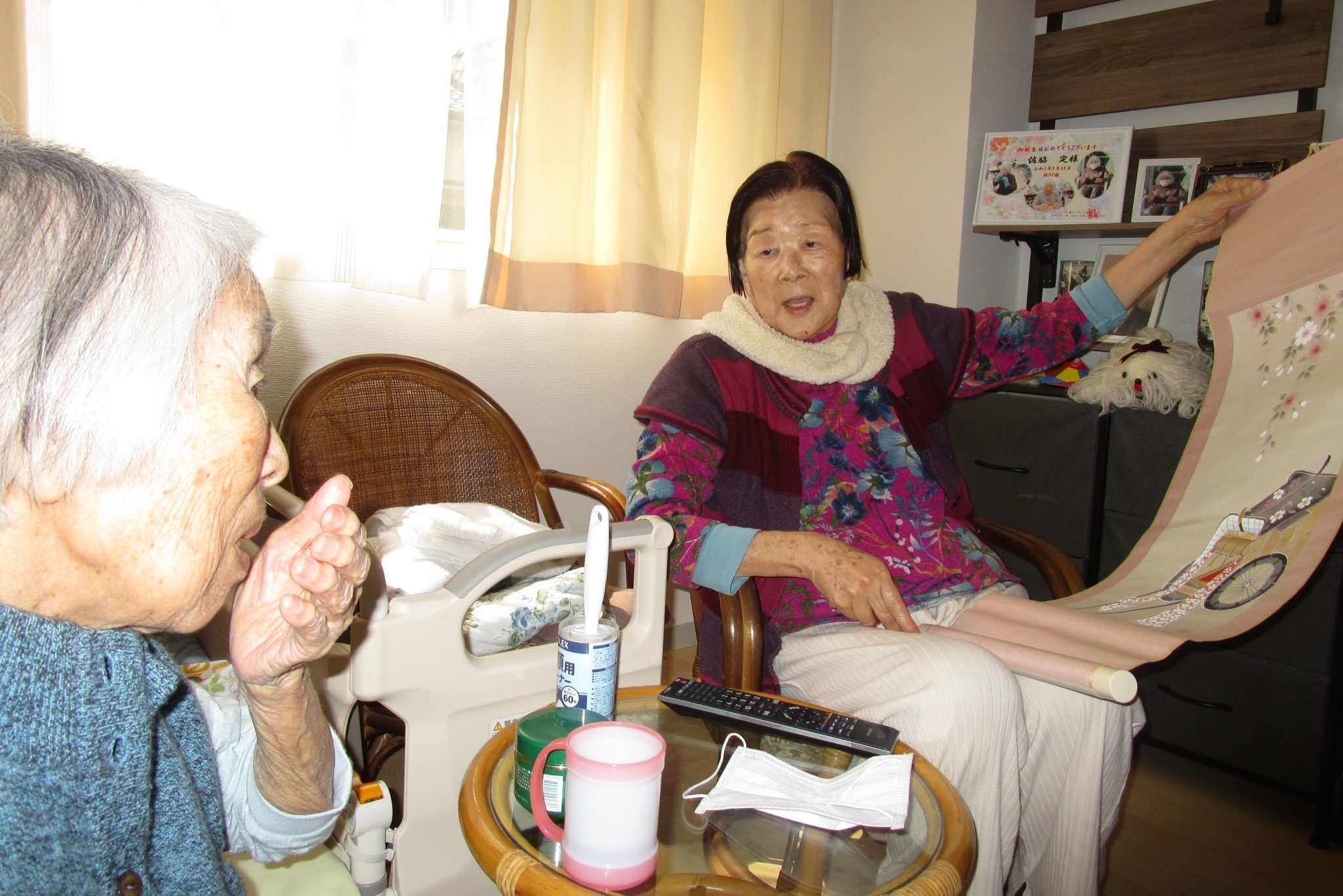 ご家族にお話を伺うと、「叔母が一生懸命作ったものだから、たくさんの方に見てもらいたい。椅子も2脚用意しているのも他の入居者さんと一緒にお茶を飲んで、語らうことができるようになったらいいなと思って。」と想いを話してくださいました。