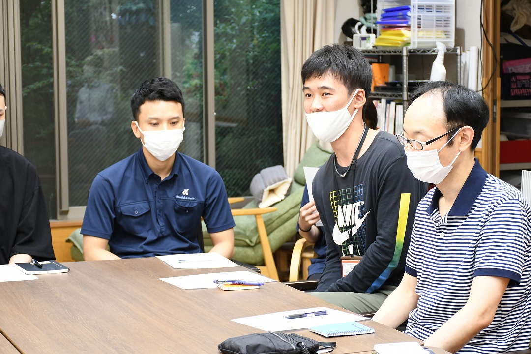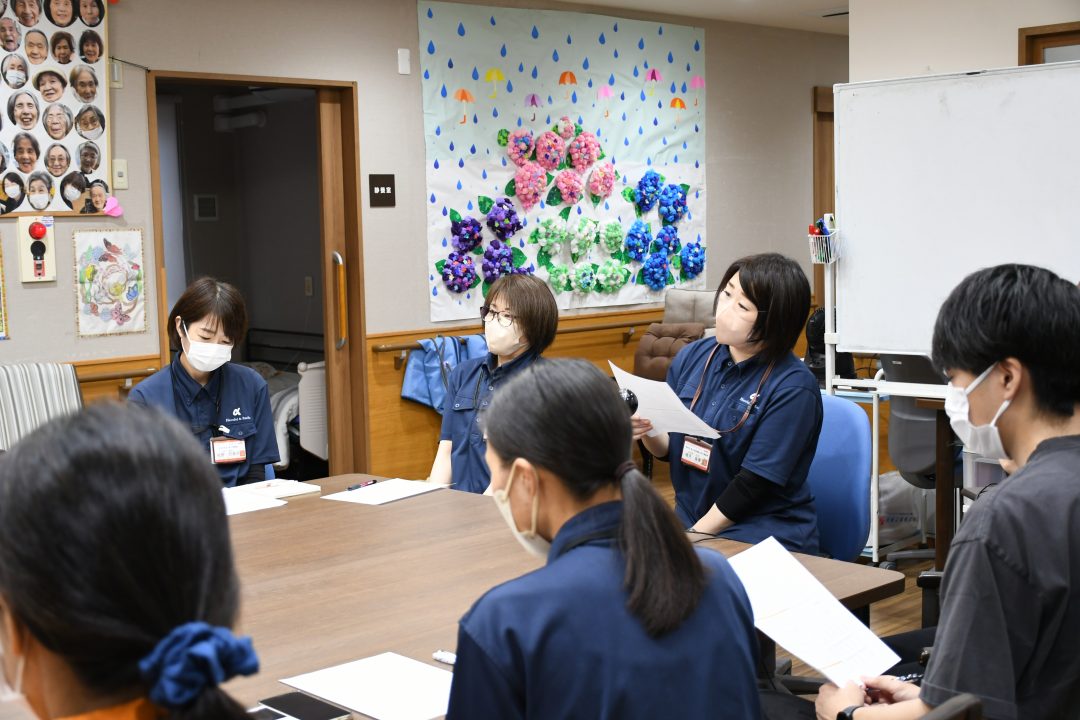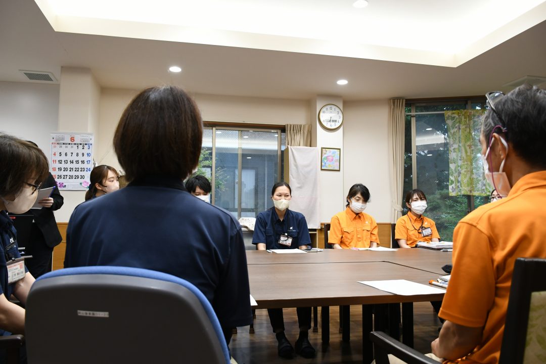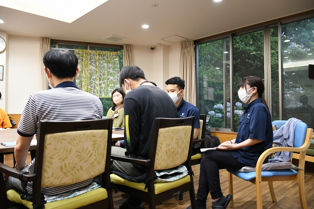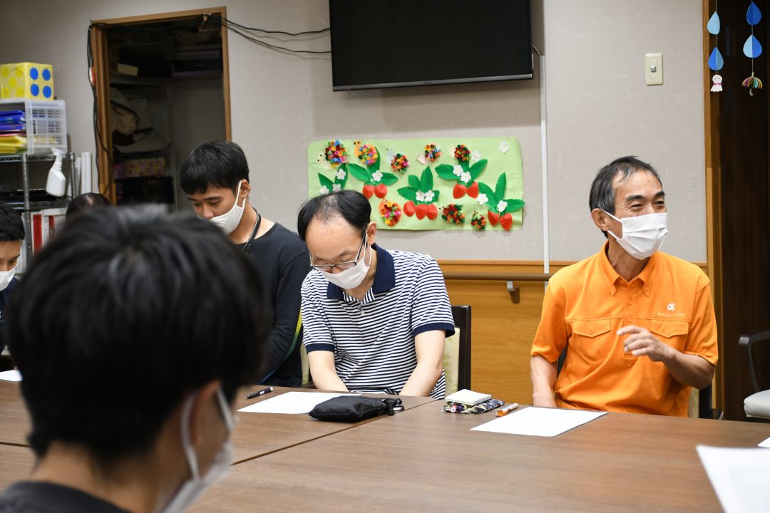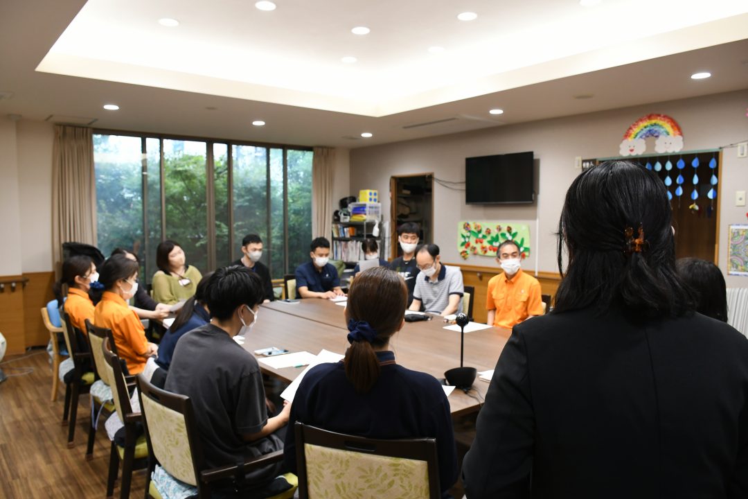ワークショップは18:00からスタート。遅出と夜勤のスタッフを除いた16名となぎさ施設長で行われました。