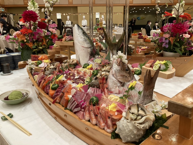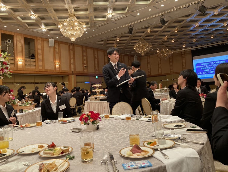 入社式後は、コロナ禍で控えていた懇親会が5年ぶりに復活。門出を祝う豪華な食事で仲間や先輩と親睦を深めました。