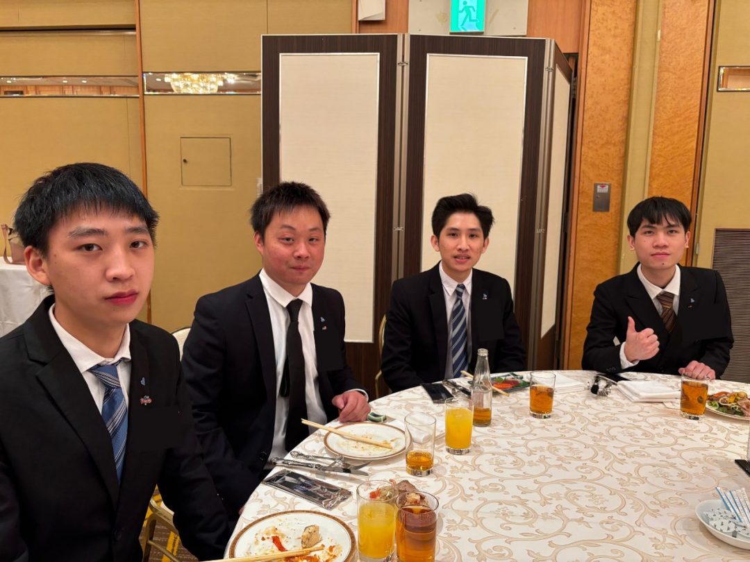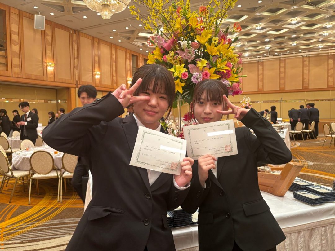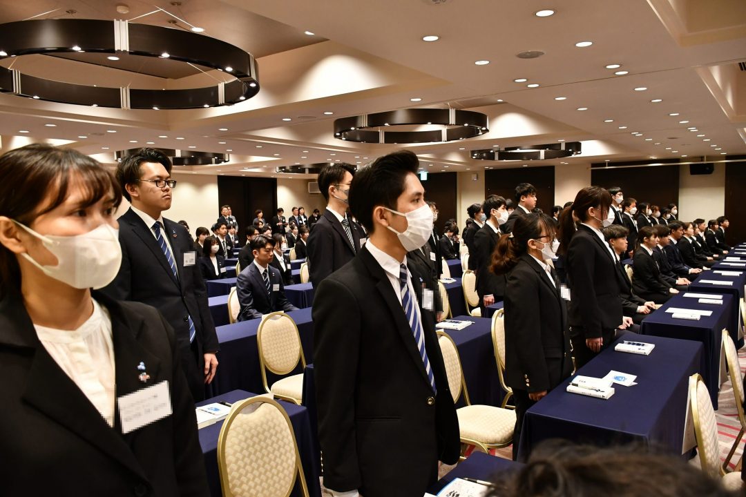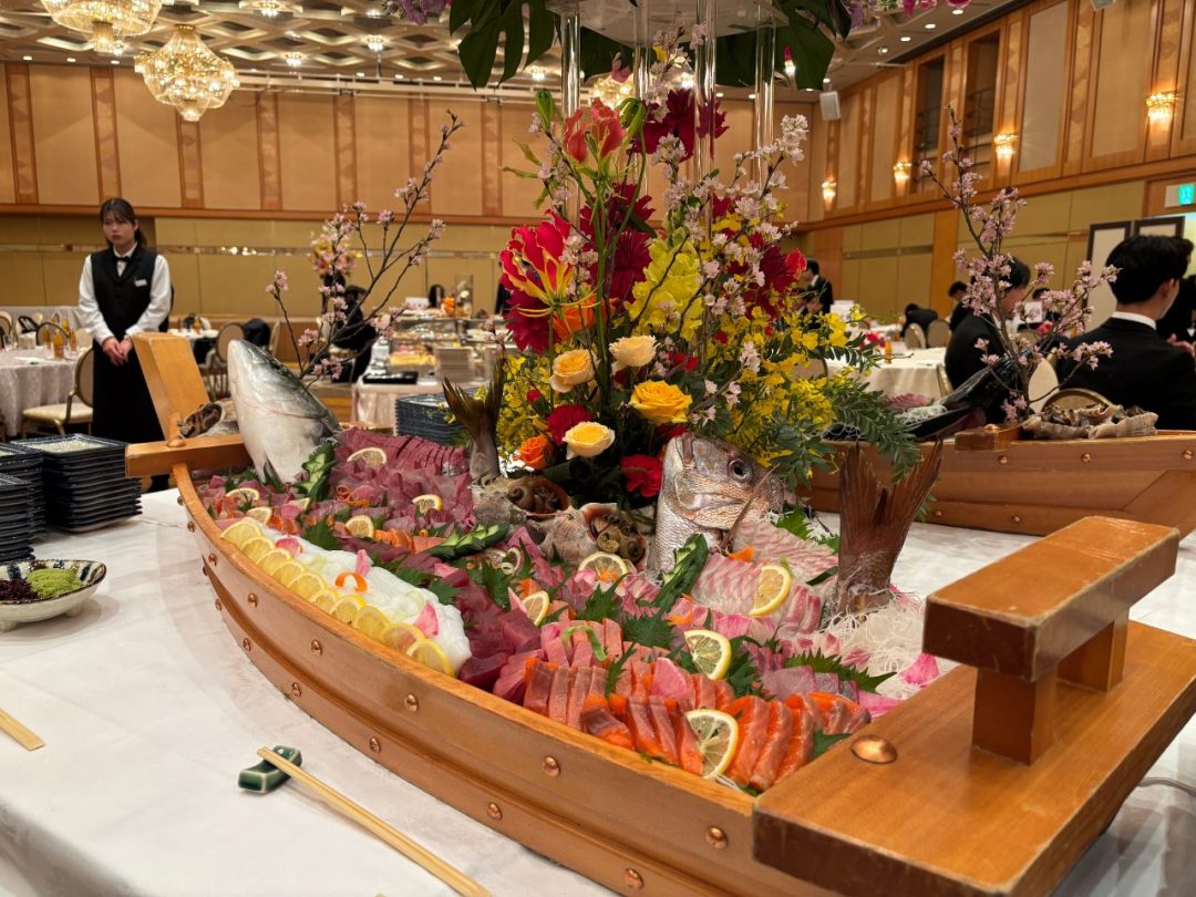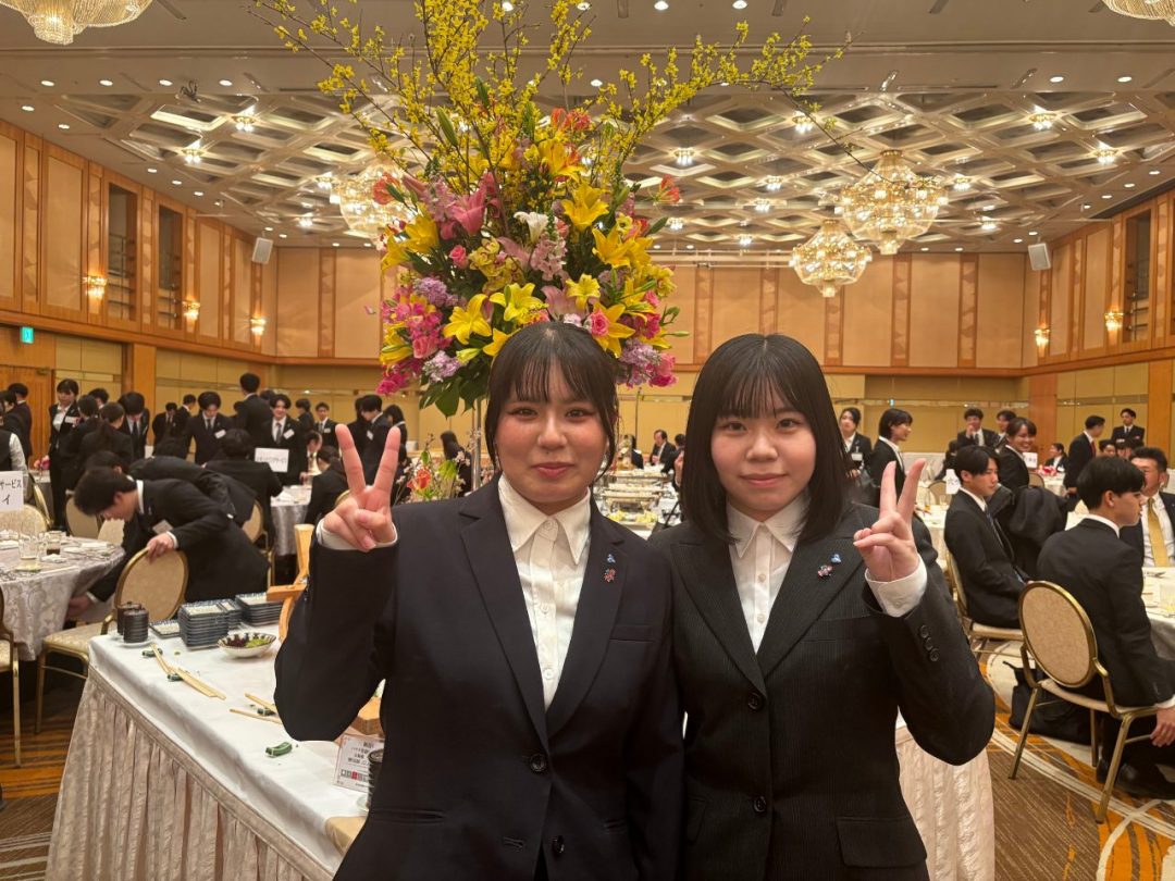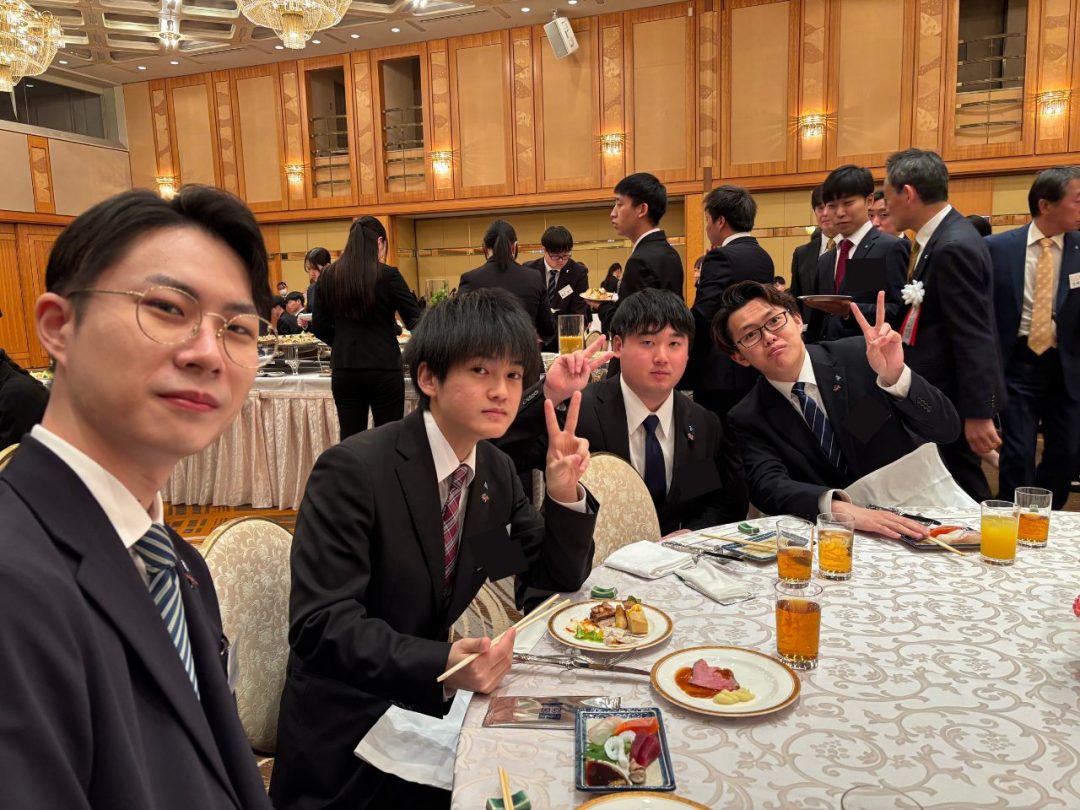 入社式後は、門出を祝う豪華な食事で仲間や先輩と親睦を深めました。