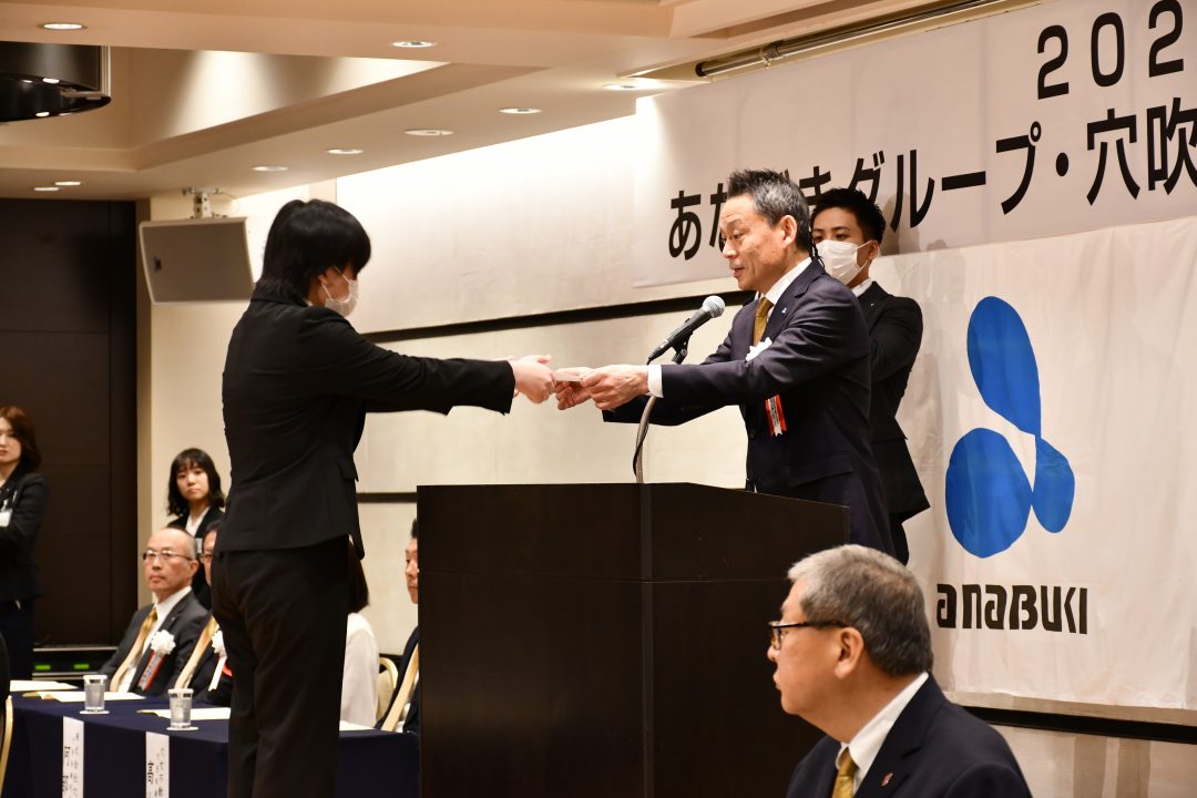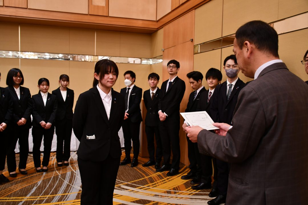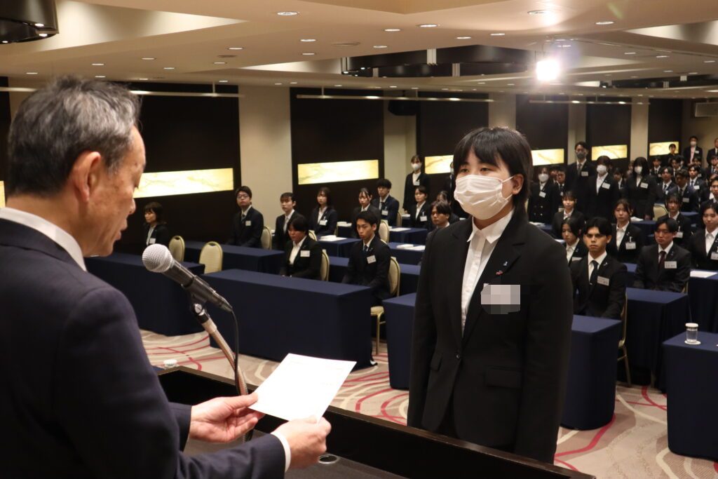 あなぶきグループの入社式は、一人一人名前を読み上げ辞令交付を行います。