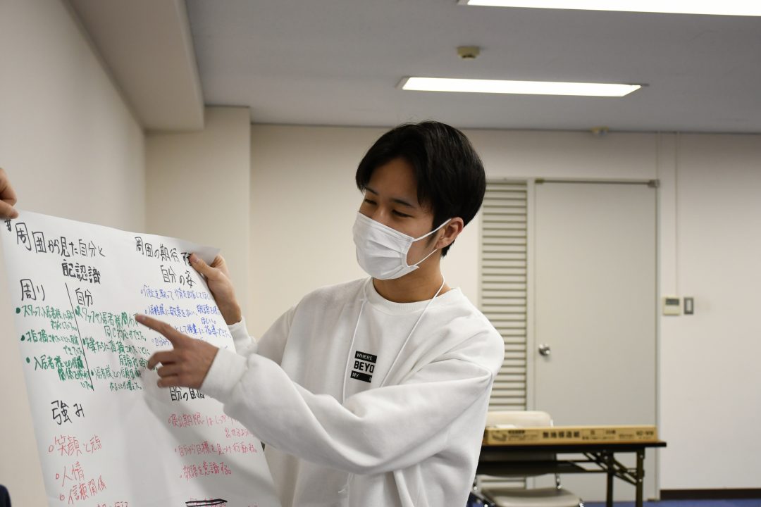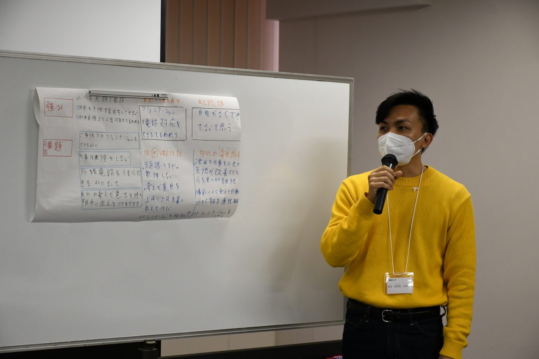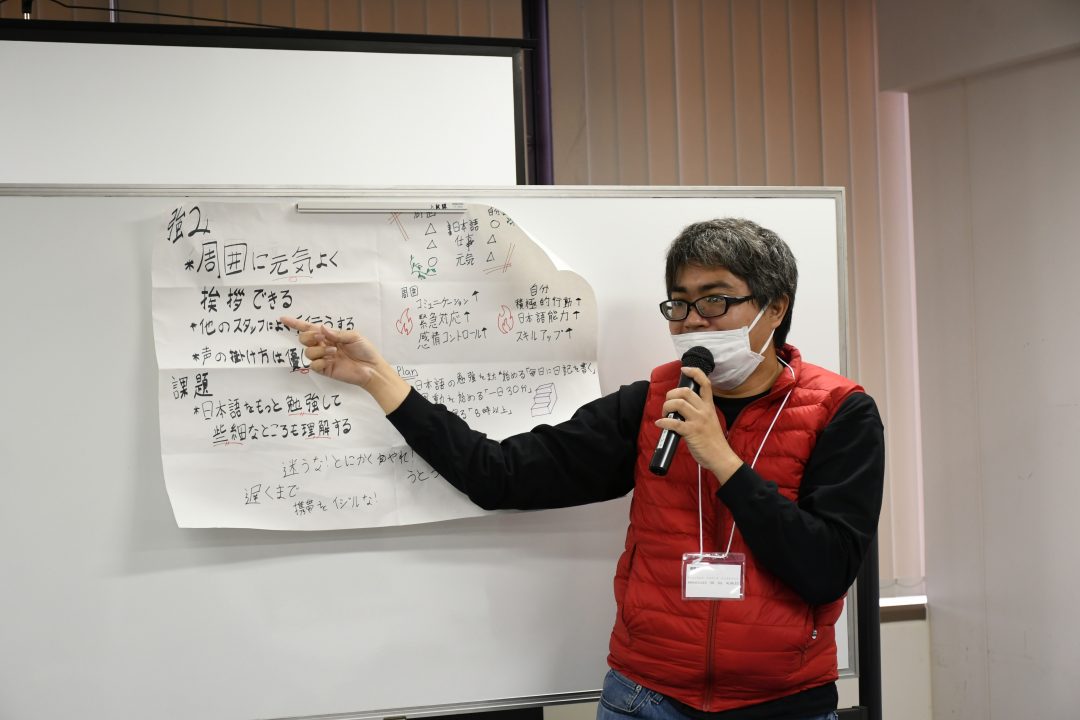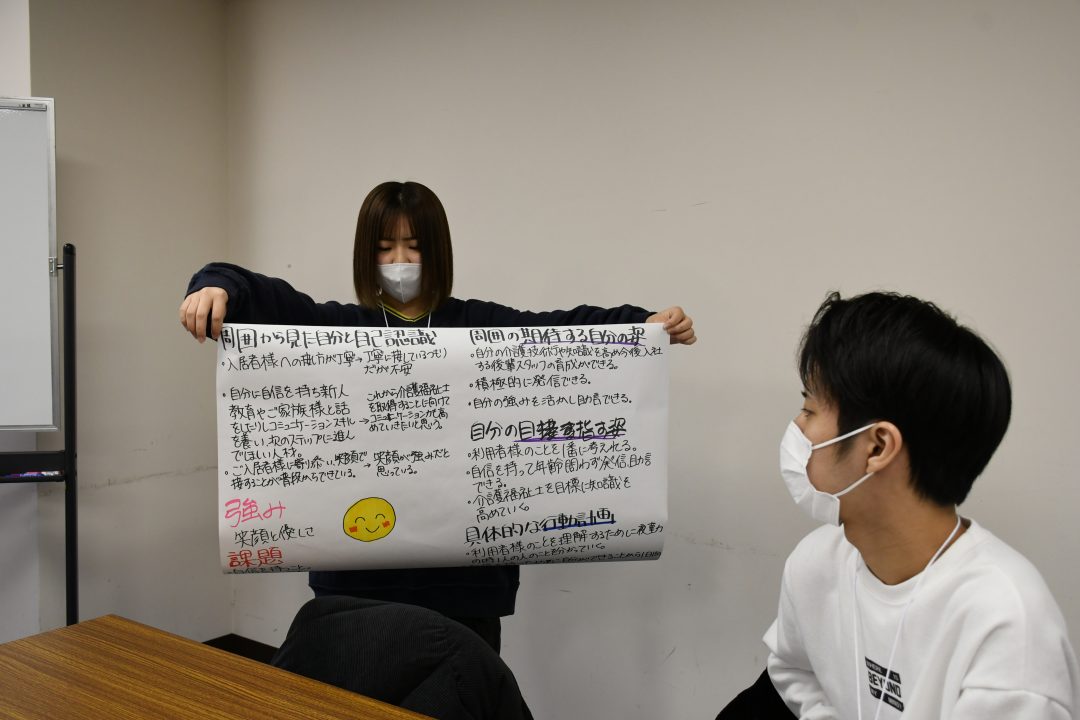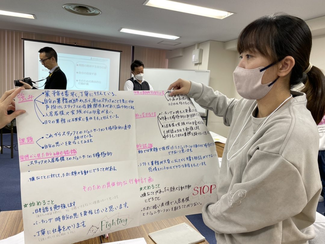 今回の研修の目的は、振り返りと目標設定です。まず、自分の仕事を振り返り自己評価をします。その後、同じホームで働く先輩スタッフが事前に答えてくれた評価と比較。その両者のギャップや先輩スタッフから期待されていることを把握し課題を見つけ、今後の目標を具体的な行動計画をもとに明確にします。