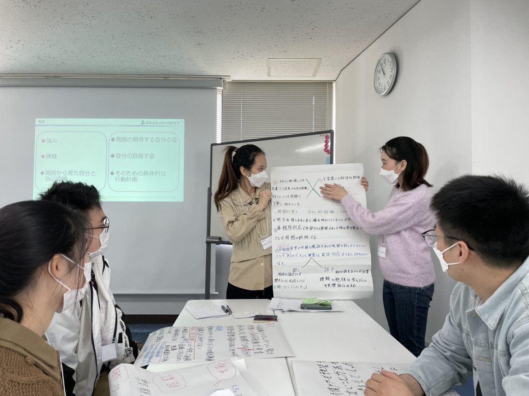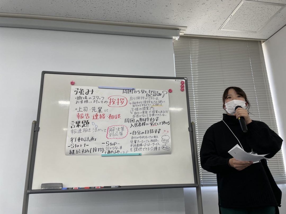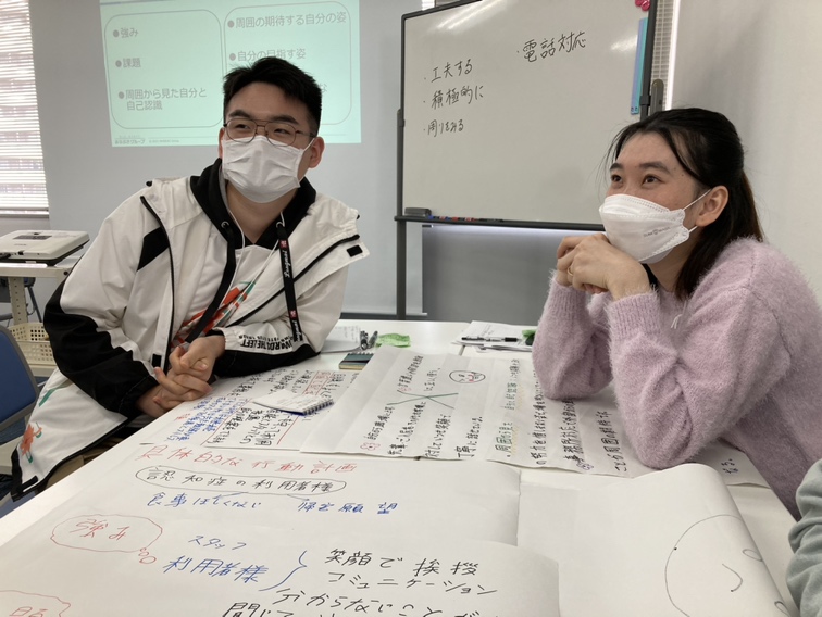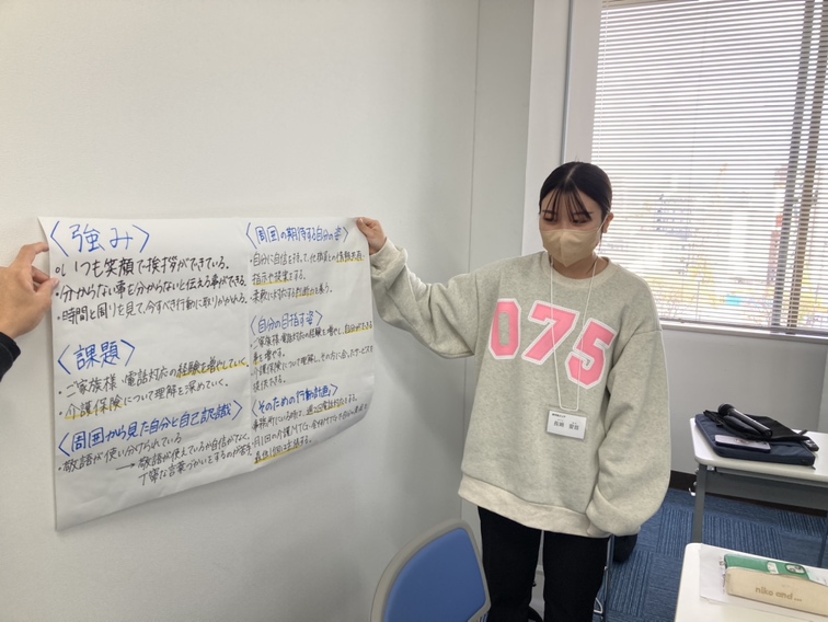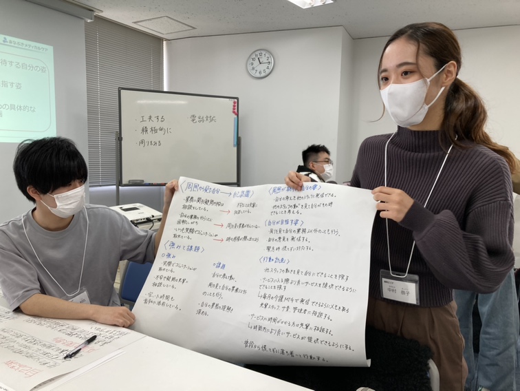 今回の研修の目的は、振り返りと目標設定です。まず、自分の仕事を振り返り自己評価をします。その後、同じホームで働く先輩スタッフが事前に答えてくれた評価と比較。その両者のギャップや先輩スタッフから期待されていることを把握し課題を見つけ、今後の目標を具体的な行動計画をもとに明確にします。