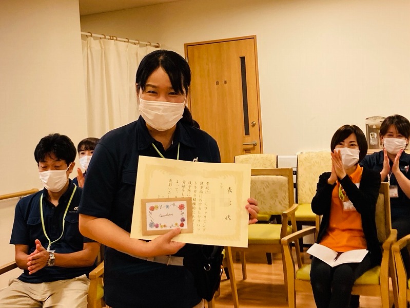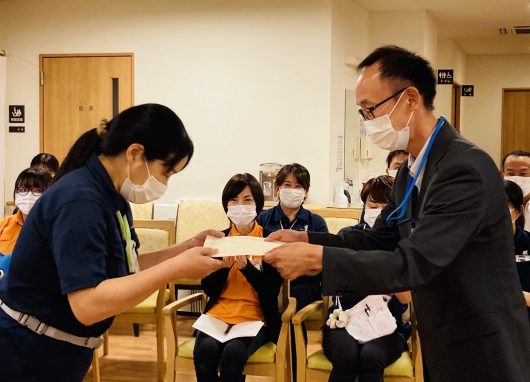 ヒヤリハット賞、ポジティブ賞、ベストトレーナー賞、顧客よしで賞をアンケートをもとに各施設で選ばれた方に表彰と商品を授与いたしました。