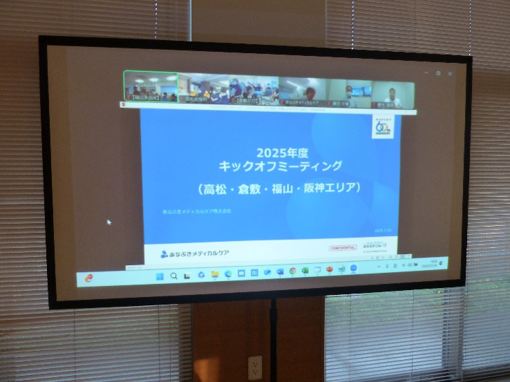 7月24日、2025年度のエリアキックオフミーティングが開催されました。第1部では、Zoomで各会場をつなぎ、社長や常務、事業部長、エリアマネージャーから、あなぶきグループの歩みや企業理念、今後の展望、そして2024年度の振り返りと2025年度の経営方針ならびに中長期計画について共有いただきました。