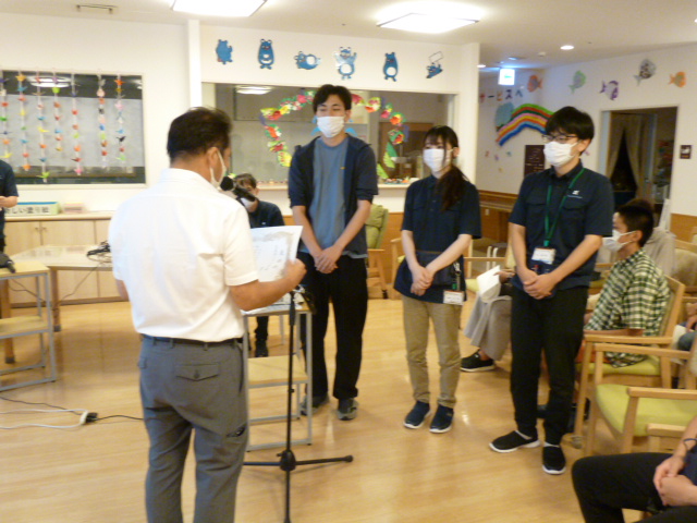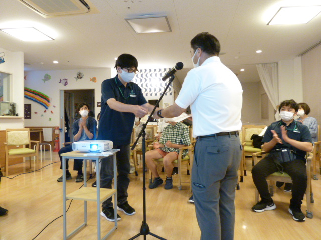 毎週日曜日に体操や脳トレを行い、ご入居者の皆さまも大勢が参加して下さり楽しみにして下さっています。そんなイベントを一生懸命頑張って実施してくれているスタッフに送られました。