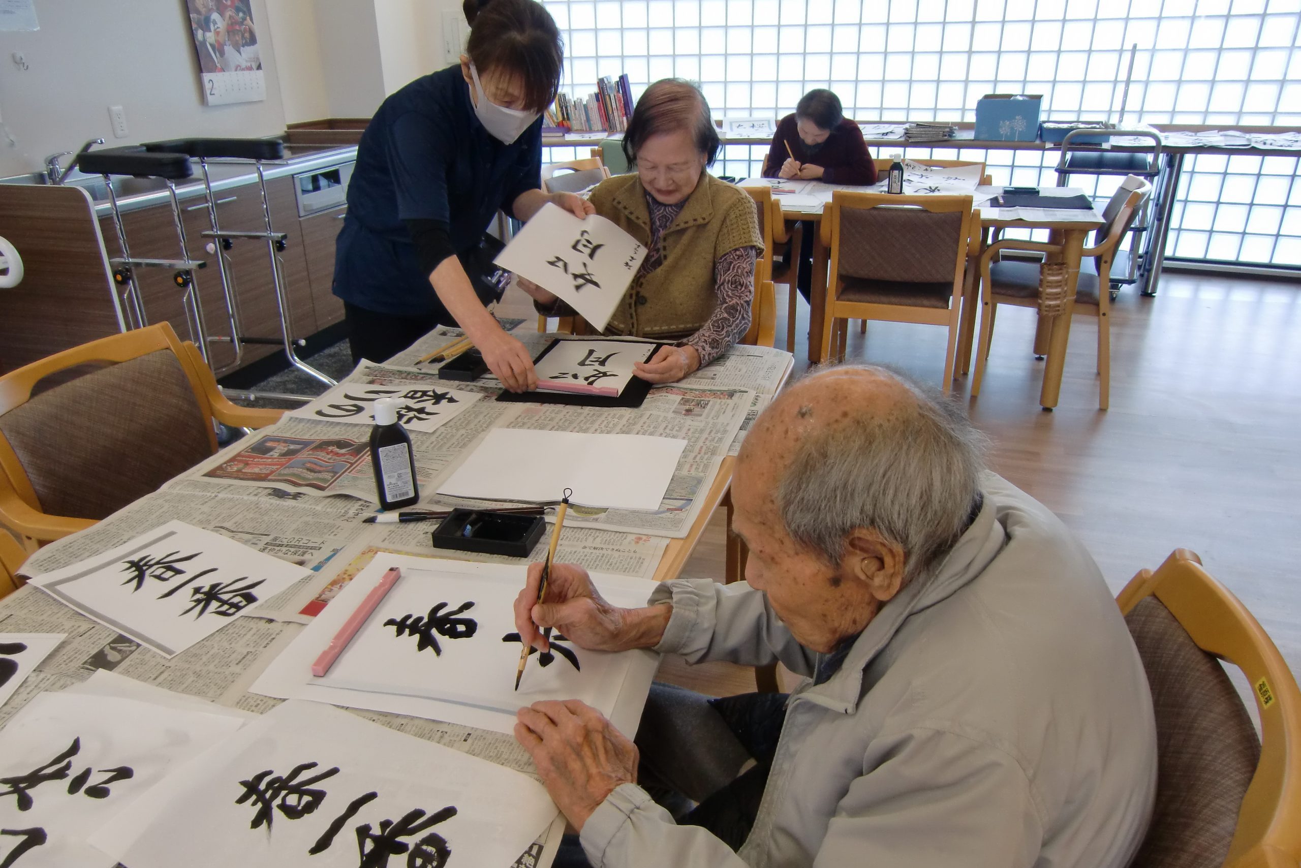 書道は、ご入居者が好きで喜んでいただけるだけでなく、筆を使って書道をすることで、ご入居者は心地いい「緊張感」を感じながら、指先を使うことで脳を活性化します。