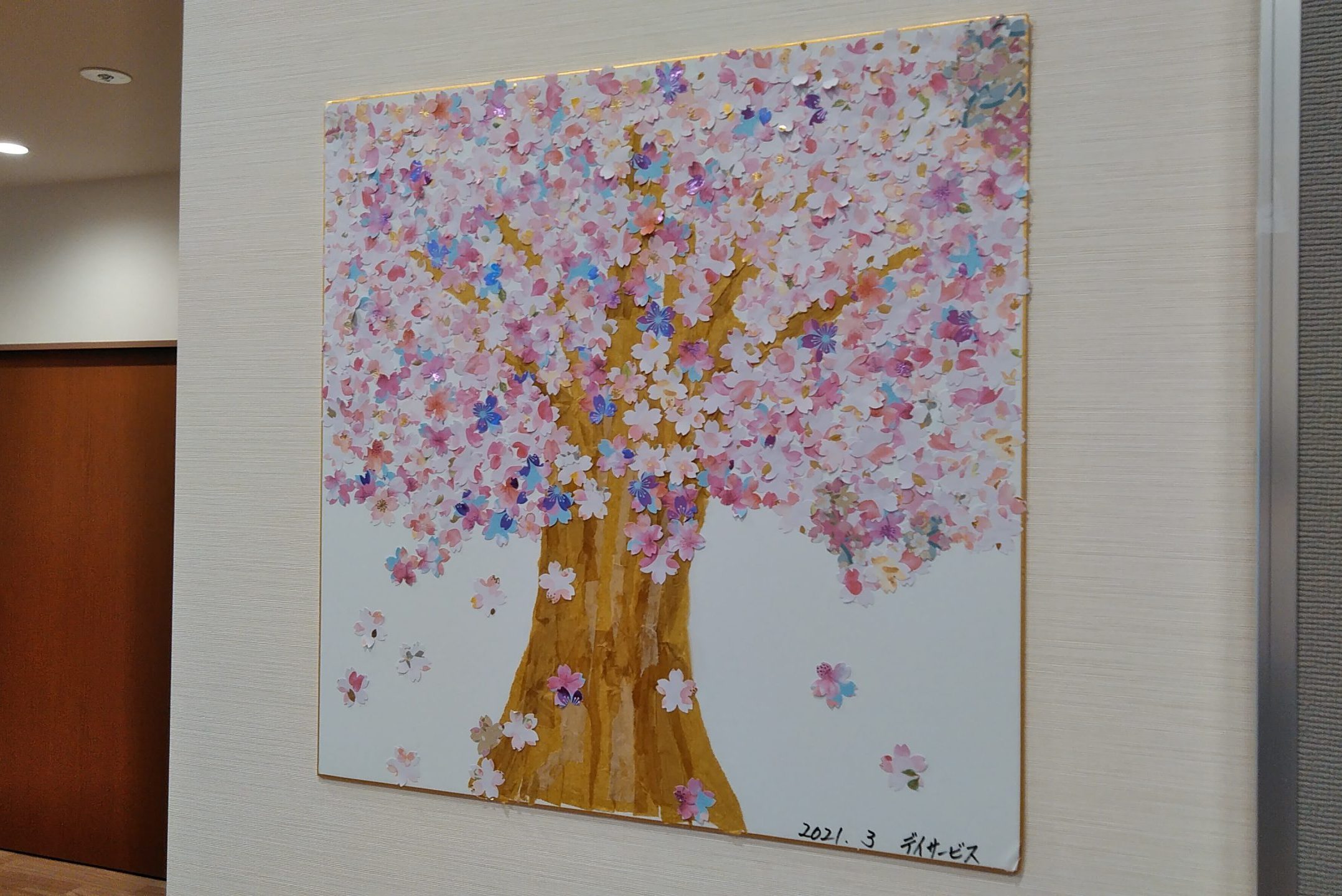飾った際には、「これ作ったの??すごい!綺麗。」とデイサービスに通所されていないご入居者の反応が大きく、その作品を見てはご入居者が「素晴らしいね!!」「デイサービスで作ったの??」などと話をしておられます。