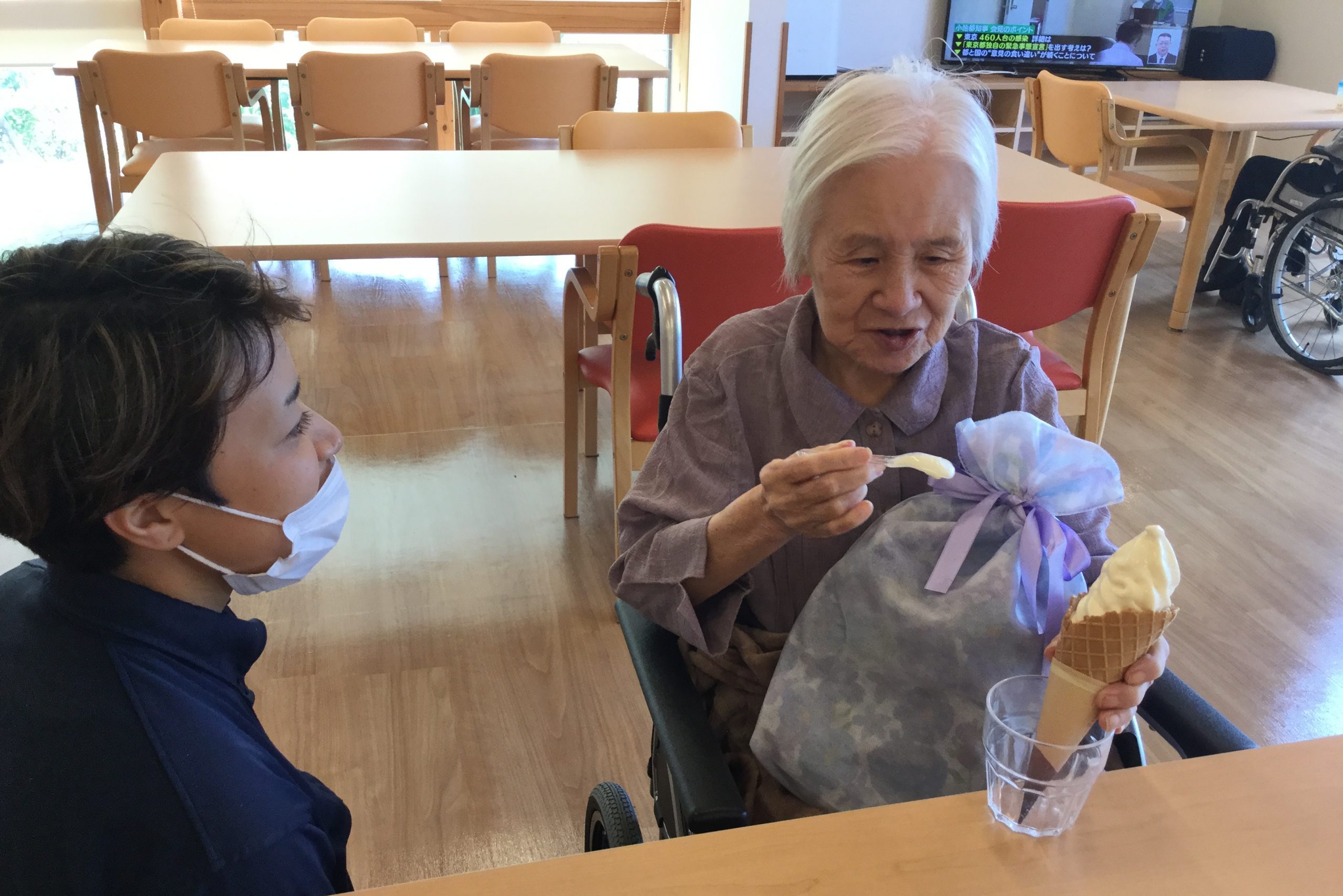 普段はベッドで過ごすことが多く、少しでも喜んでもらえるような事があればいいなと思い、Mさまにご希望をおうかがいすると「冷たいソフトクリームが食べたい」とおっしゃいました。