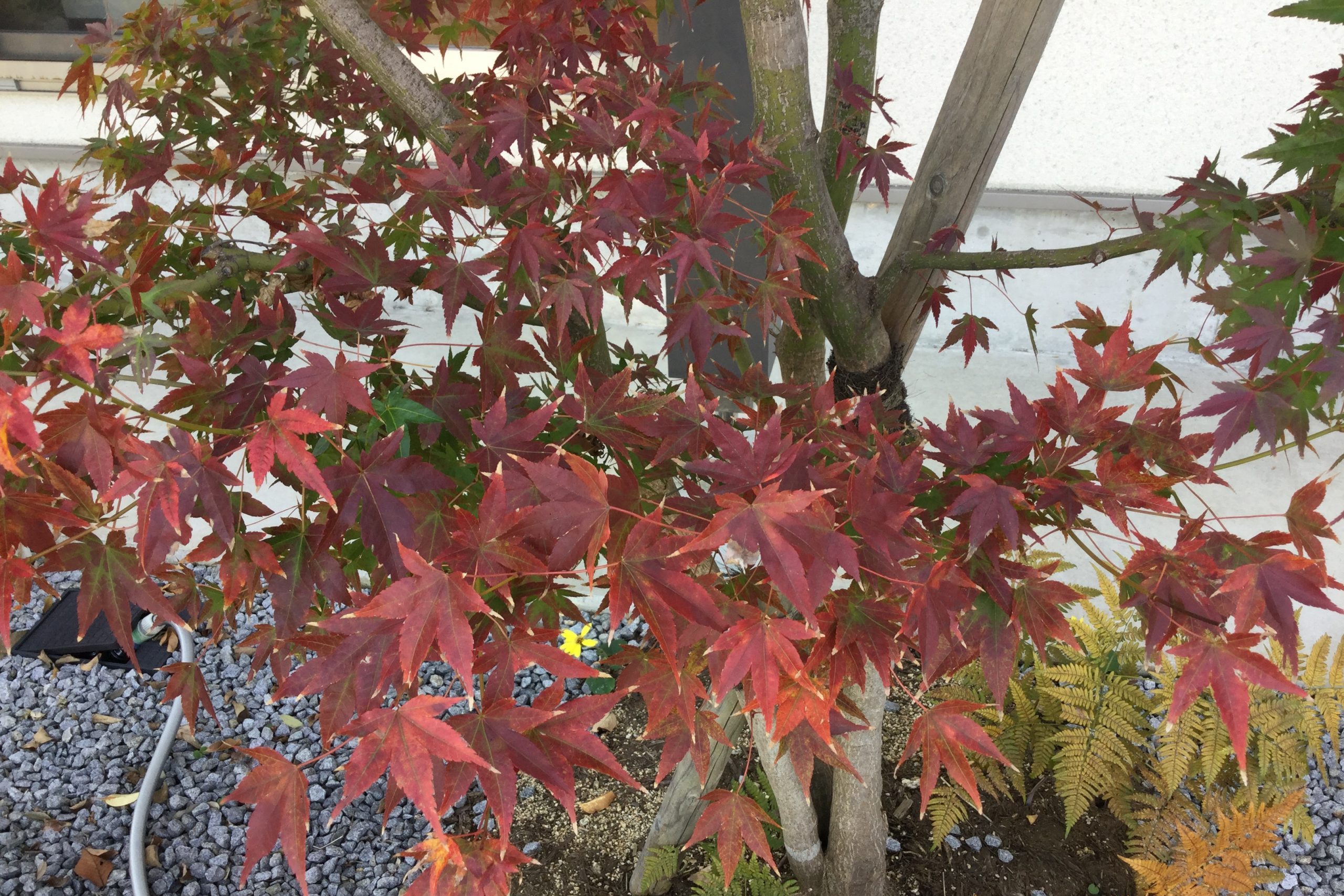 まず、玄関を出て西方向へ歩いて行くと、もみじの木が鮮やかな赤色に色づき始めていました。