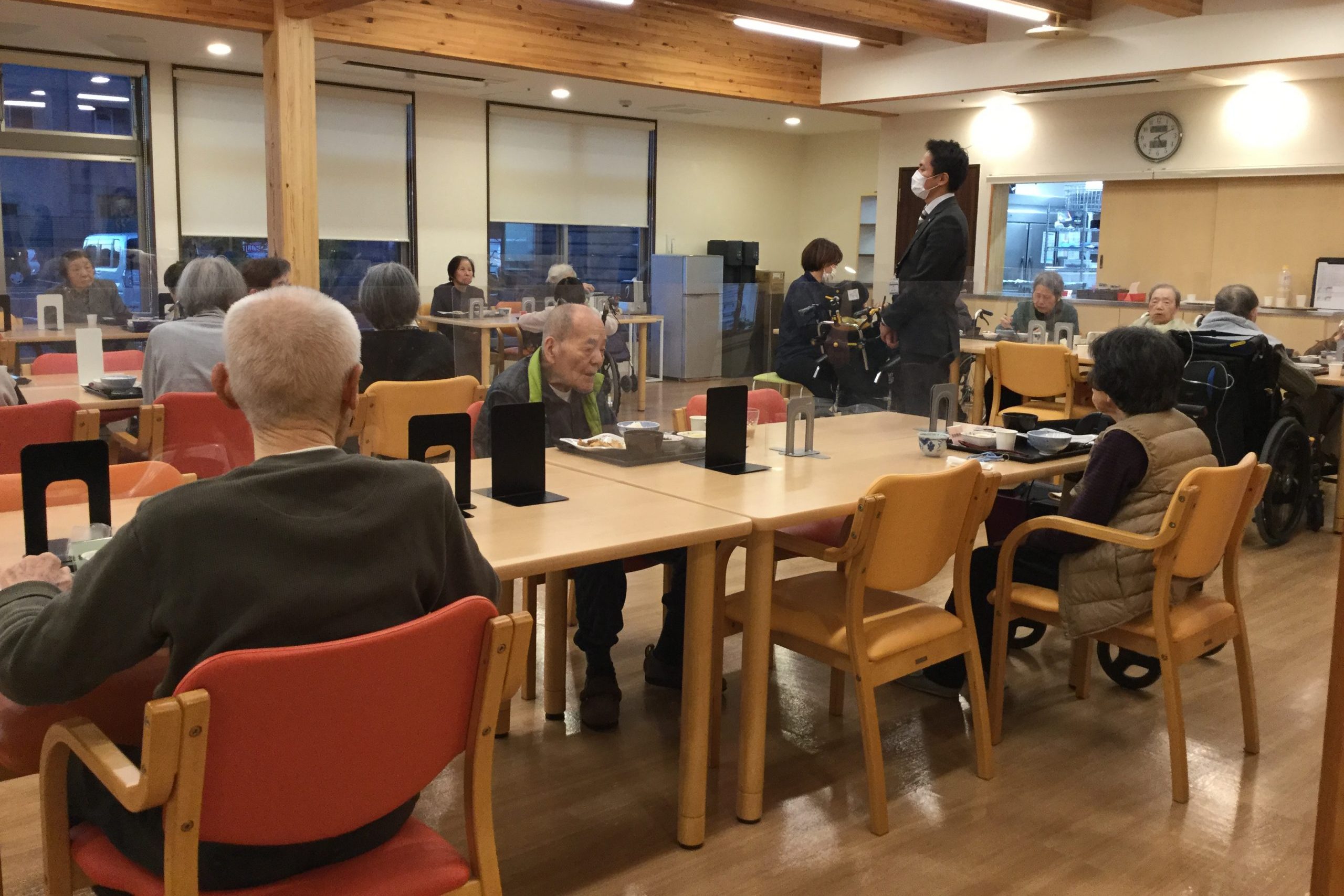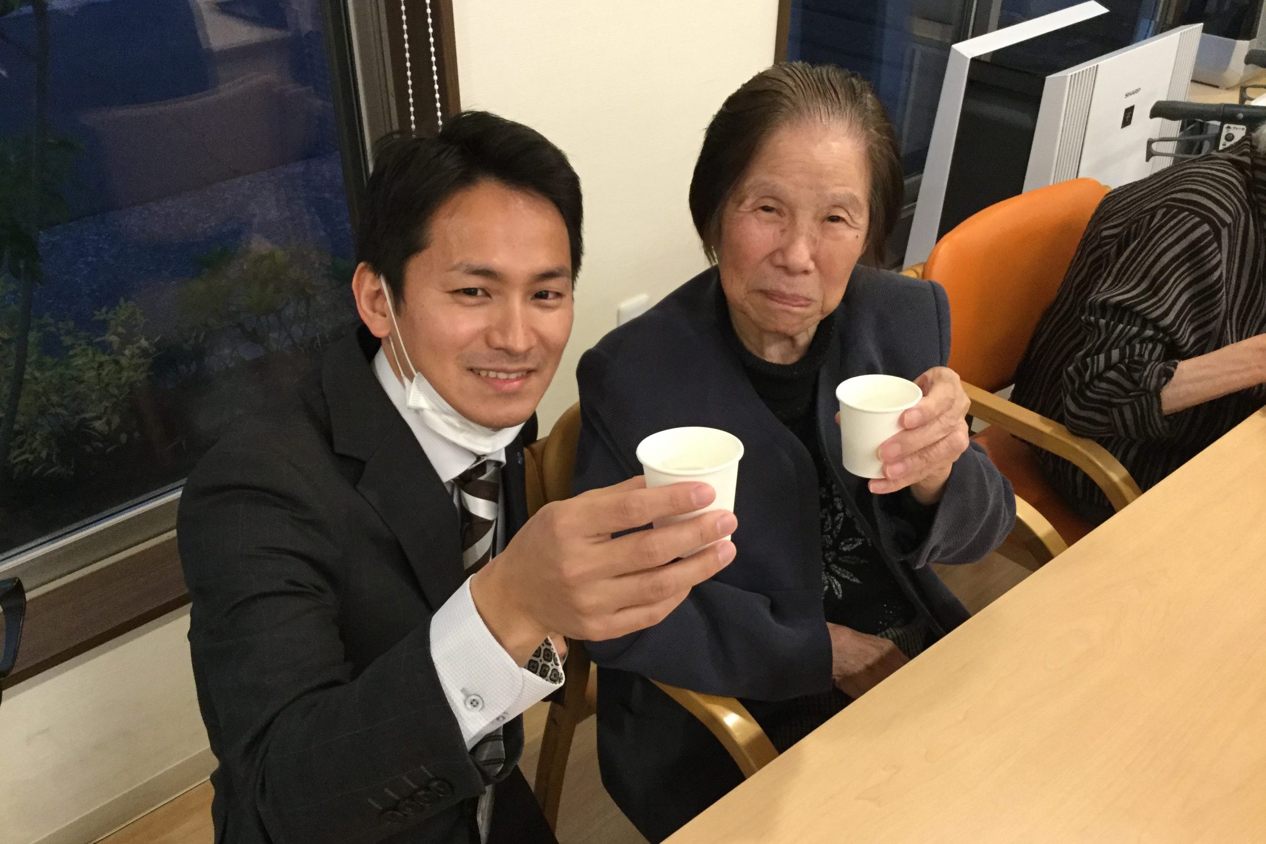 そんな皆さまに新しい施設長を知っていただくために、着任のご挨拶と、お客さまお一人おひとりと甘酒で乾杯をしました。
