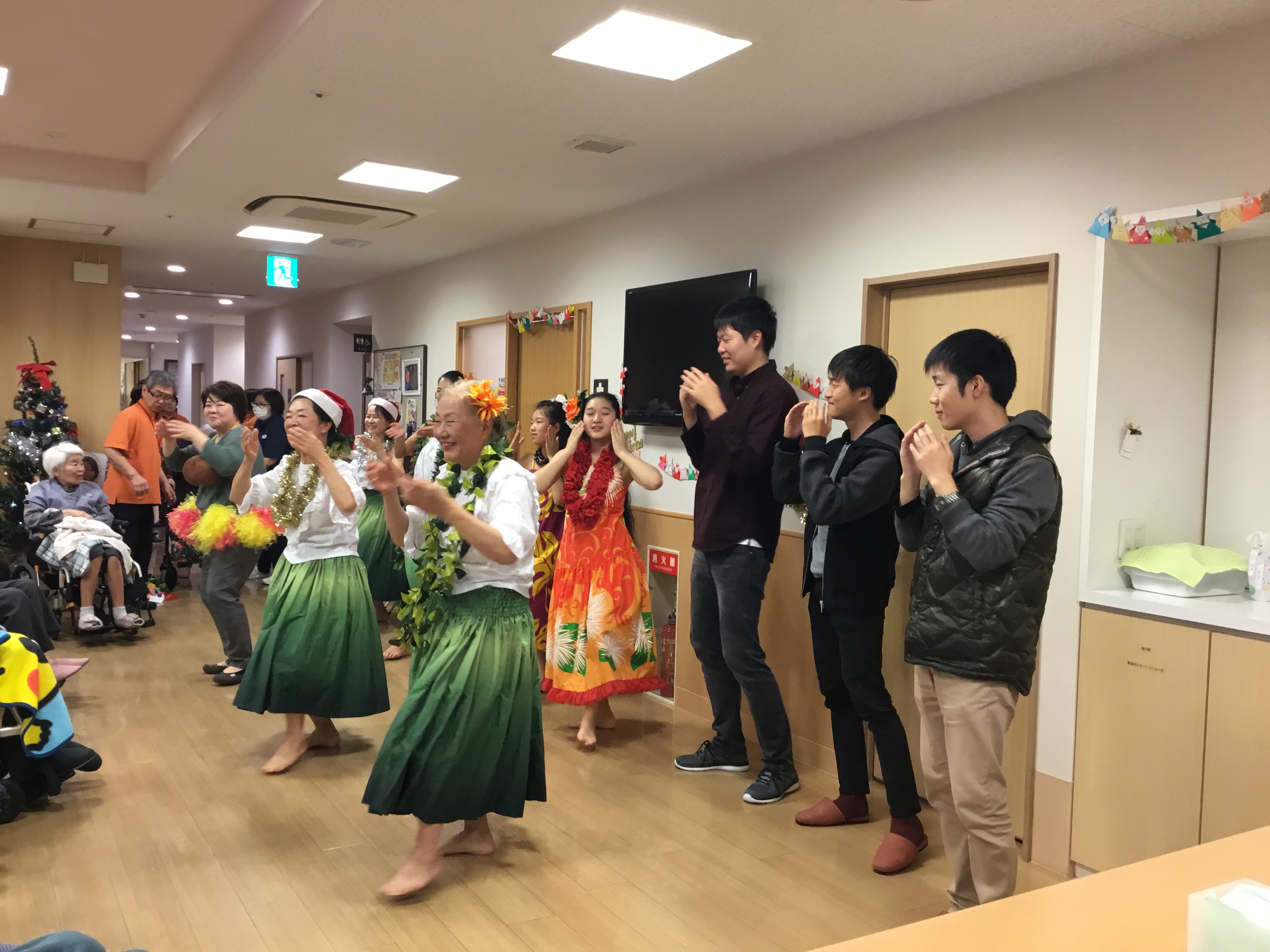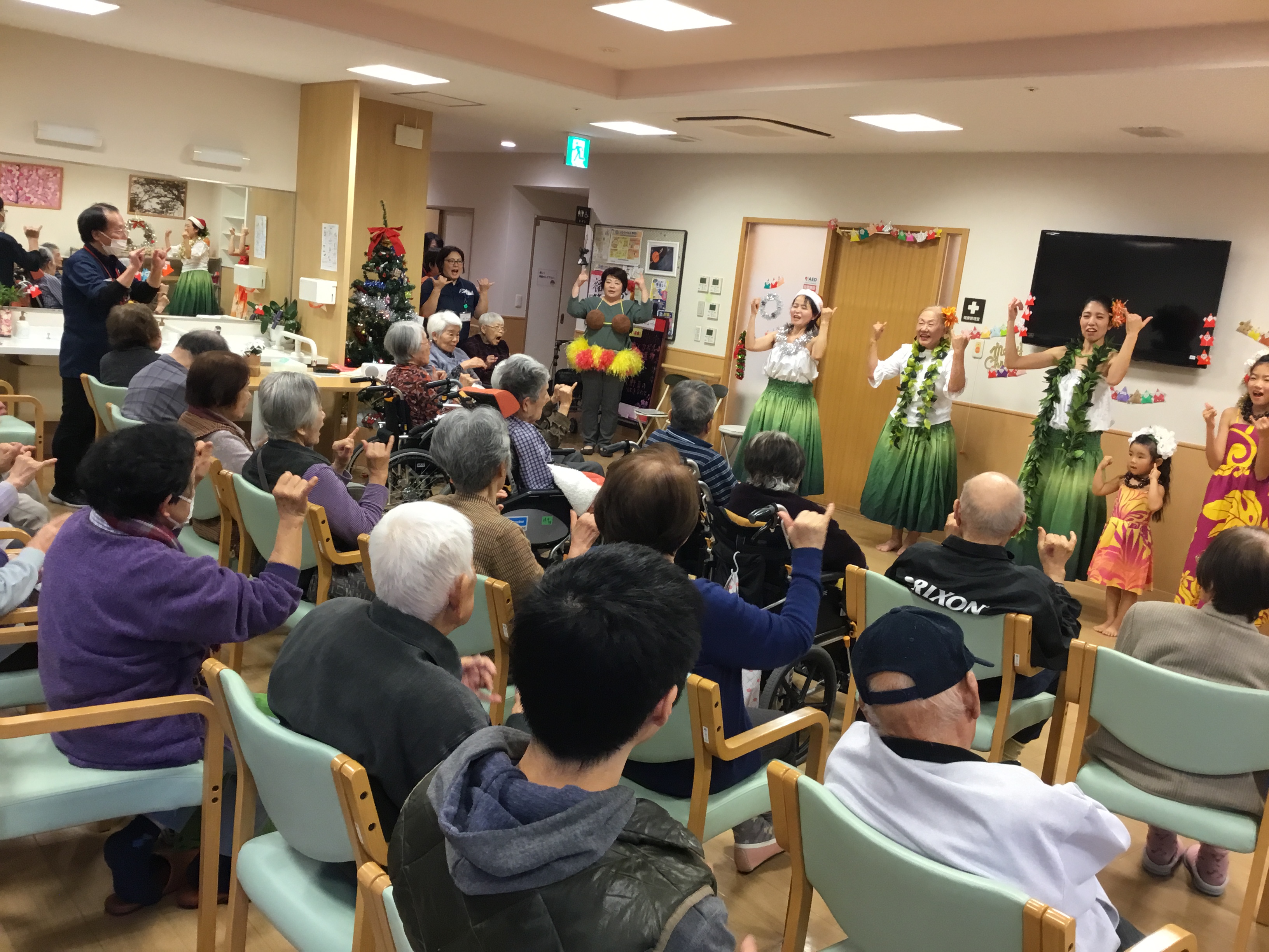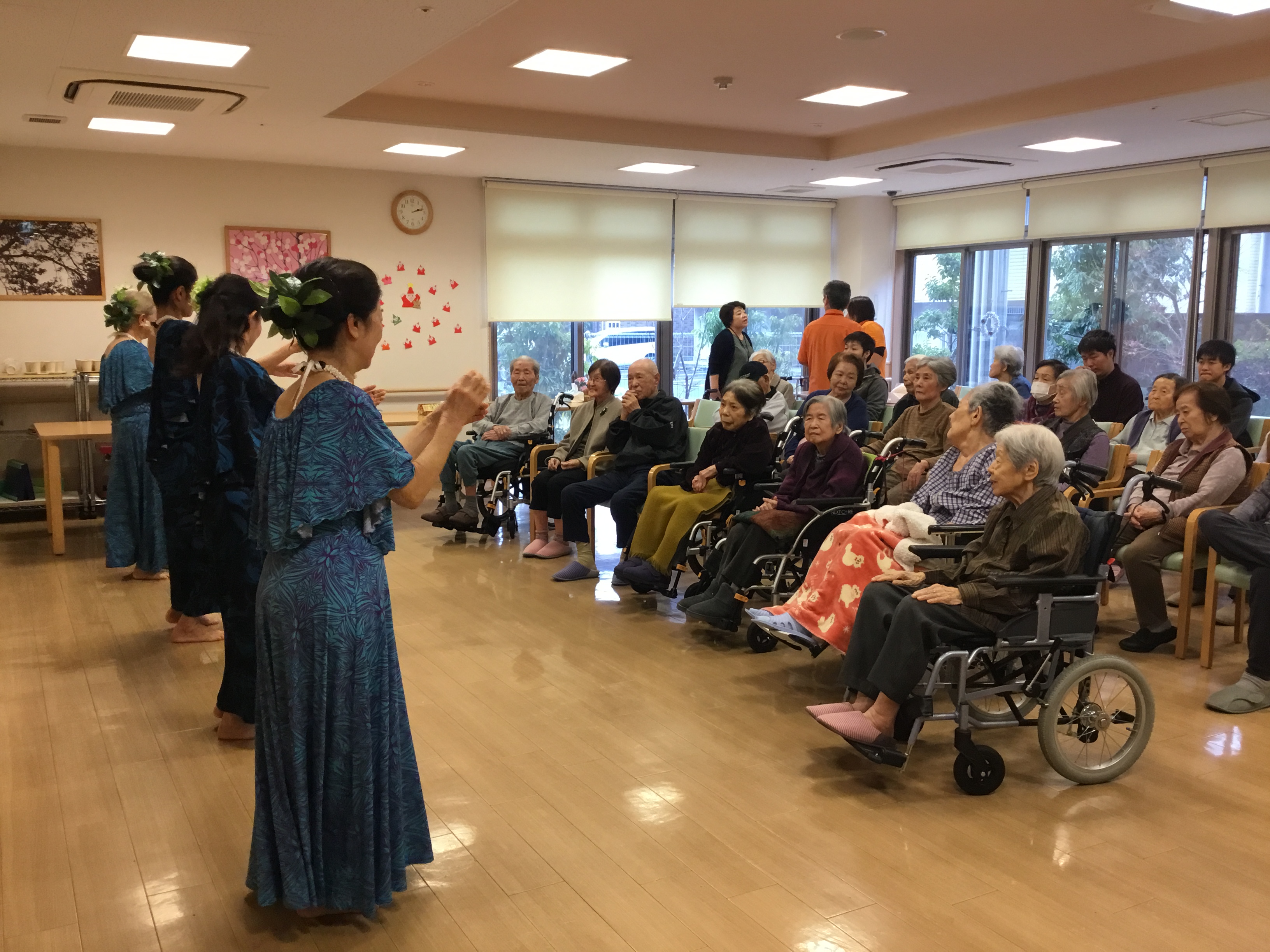 デイサービスのスタッフとホームのスタッフが企画し、「フラダンスチーム」の皆様に来ていただきました。