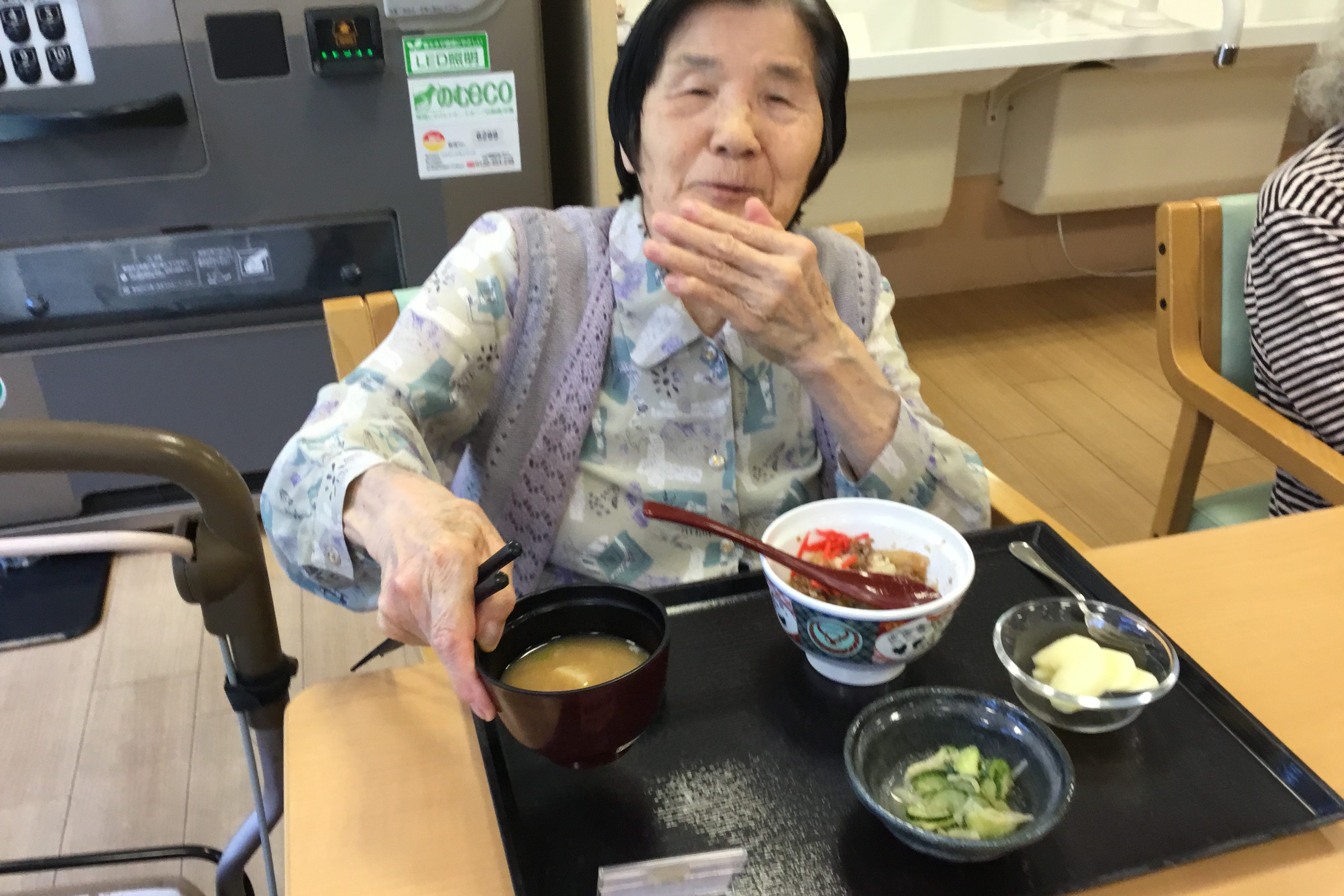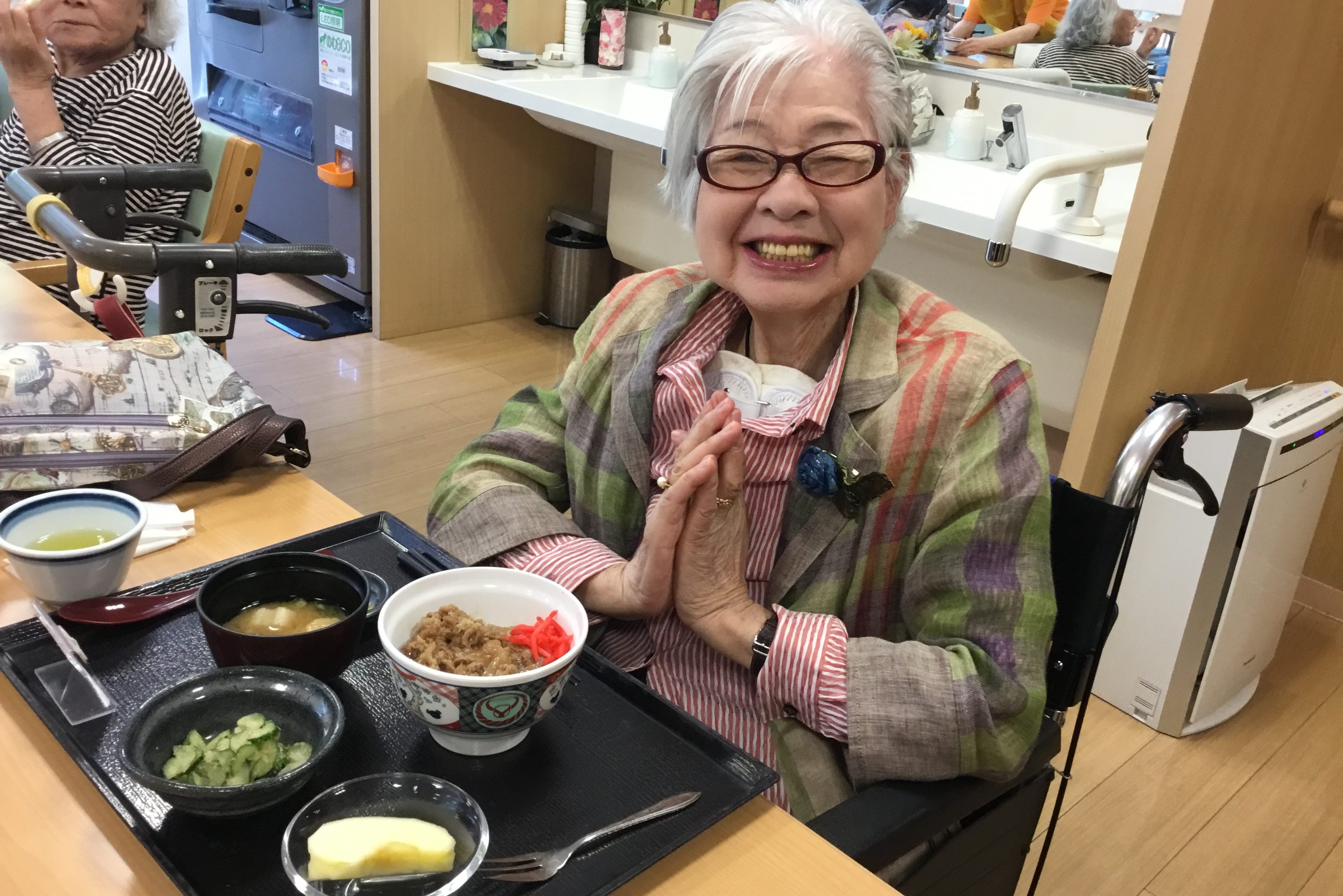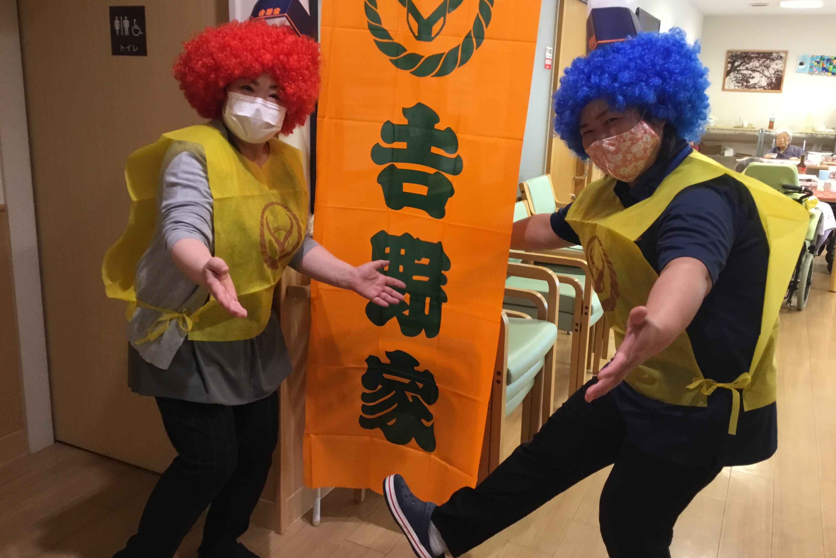 「吉野家」ののぼりを掲げ法被姿のスタッフに、ご入居者は大喜び。