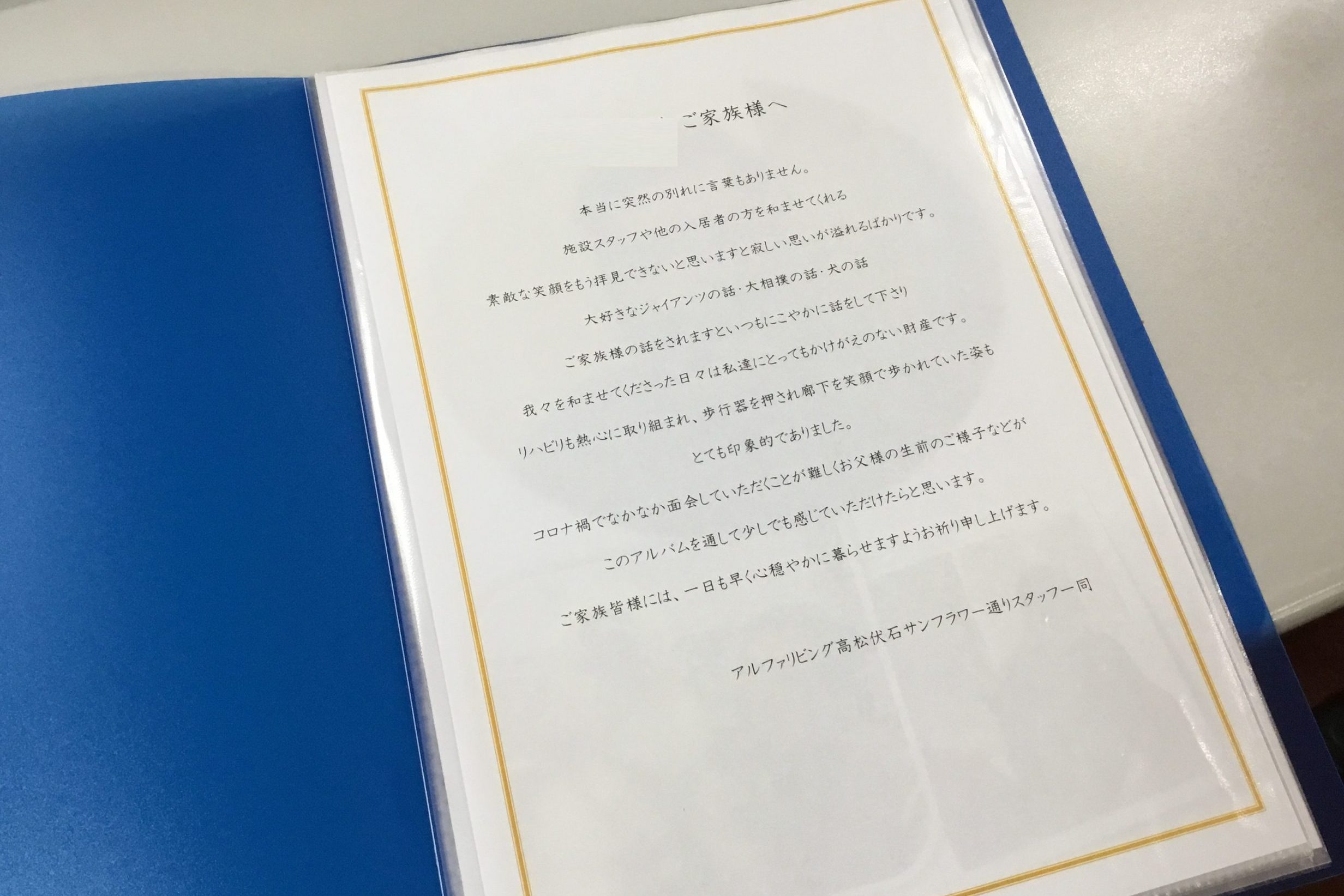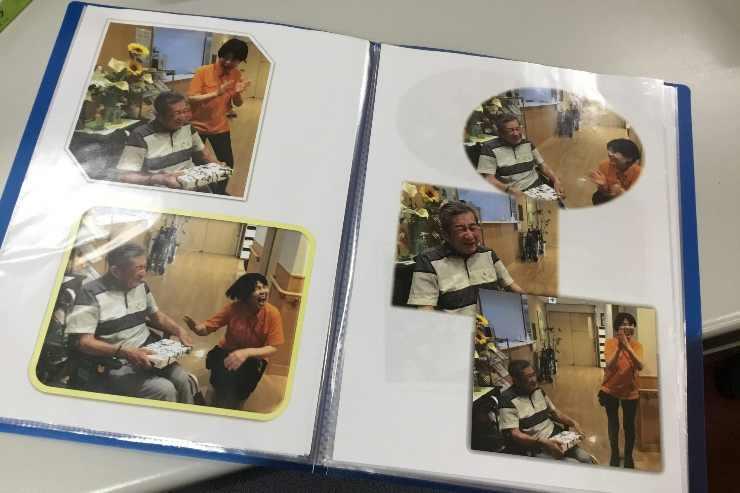 「何かしてあげられたら」とのスタッフの提案で、ご家族に6年間のホームでの生活をアルバムにしてお渡しすることにしました。