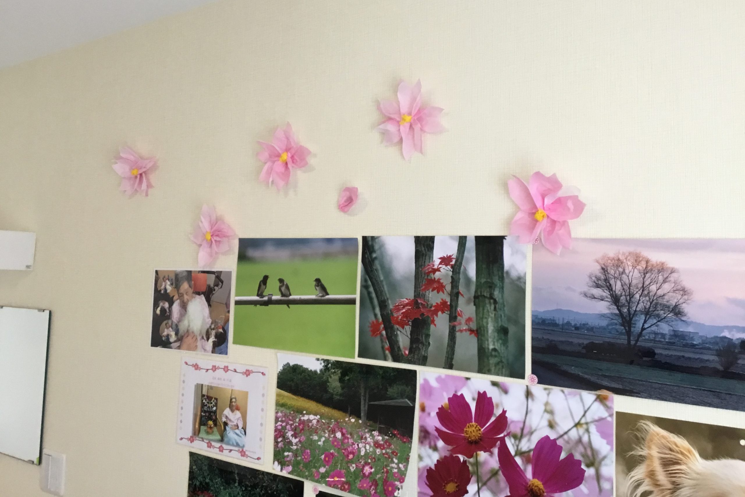 お花見が終わりイベント委員のまついさんが、お連れできなかったご入居者皆さまのお部屋に桜の写真を飾りました。