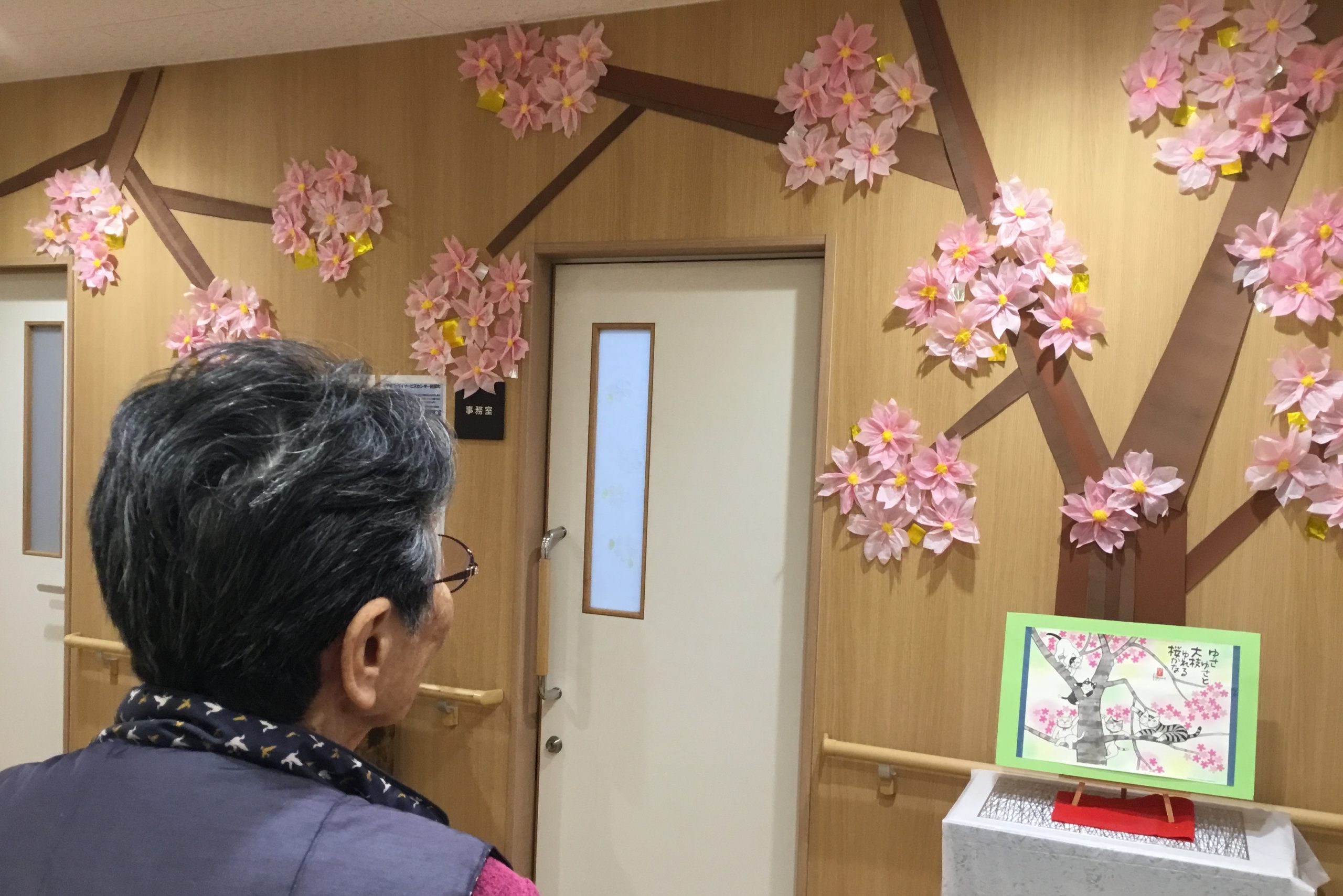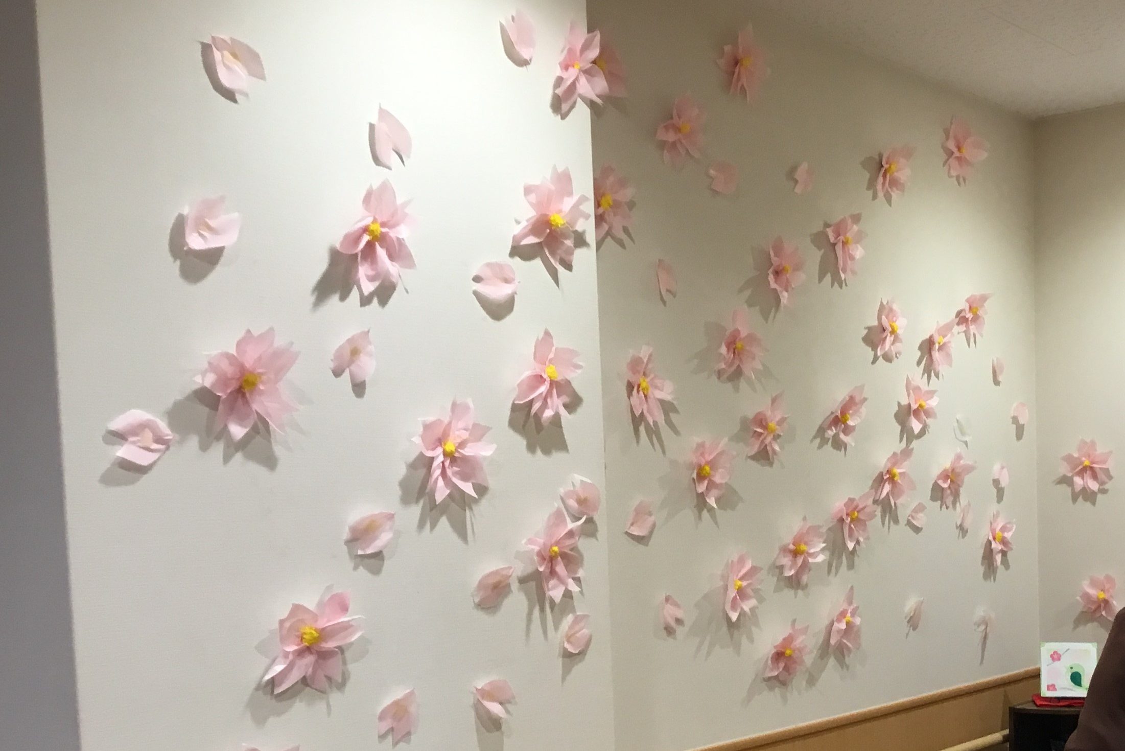 イベント委員の介護スタッフおかのさん主導のもと、ホーム内に桜が満開になりました。