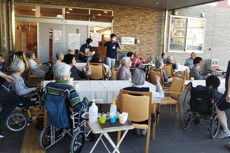 そこで 少しでもそのお気持ちを叶えられないかなと、「アルファリビング博多南玄関前で 茶話会をしよう!」とケアマネ発案で企画しました。