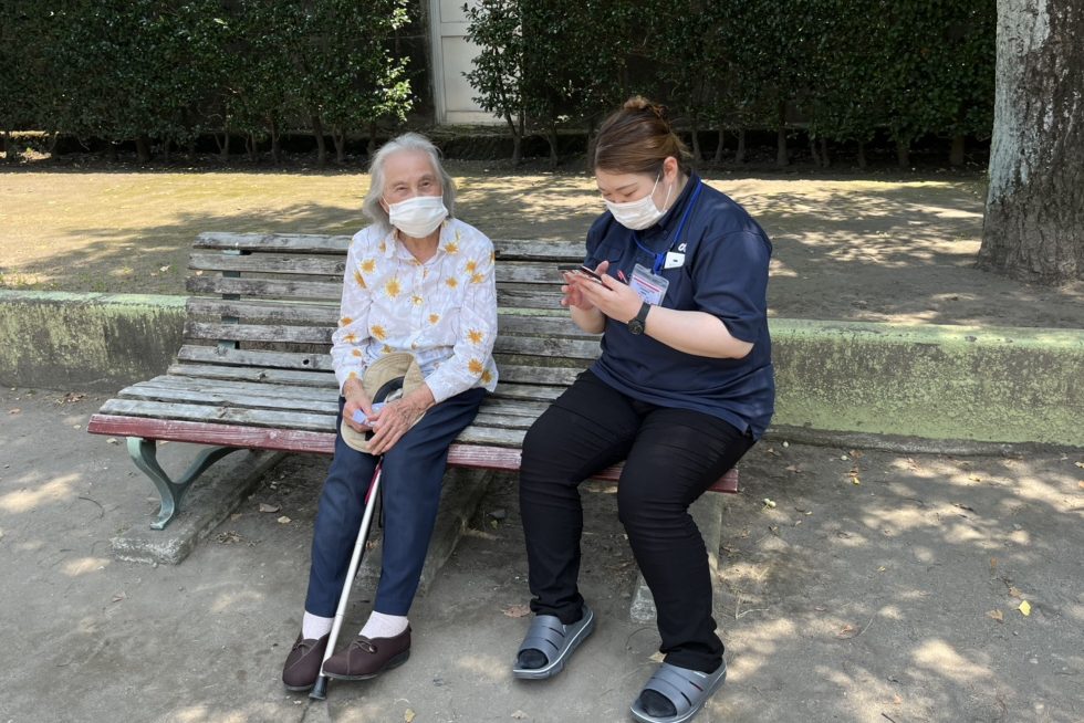 屋外の歩行は、建物内と違い手すりがないことや地面が凸凹しているところもあるため、室内よりも歩行訓練になりますし、ご入居者からも「外の空気を吸いながら見る景色も変わるし外の方がいい」と好評です。
