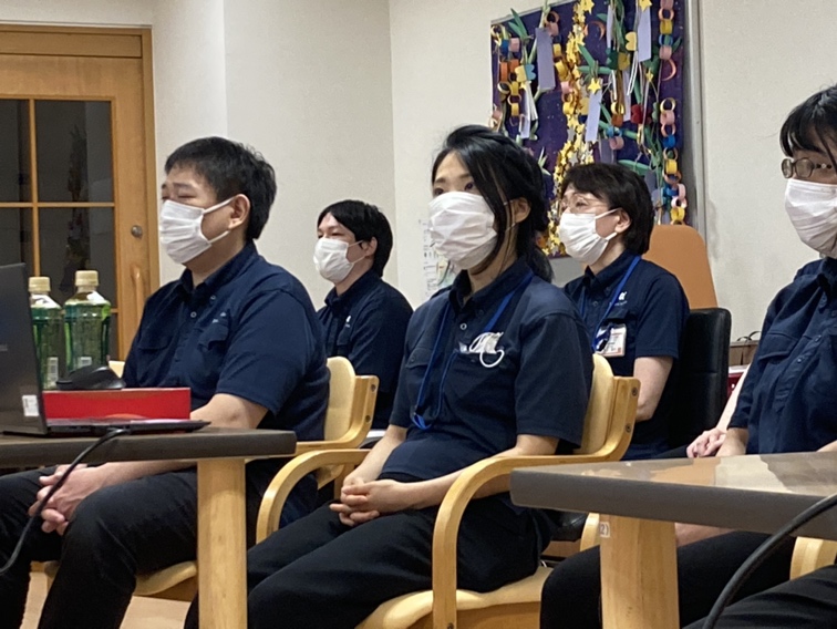 緊張した面持ちで、真剣に話を聞いているスタッフ。