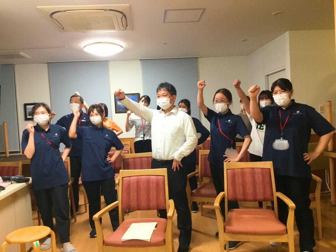 ミーティングの最後には全員で「やればできる!おー!」と拳を掲げ、気持ちを一つに。今年度も“自分たちの施設でも賞をとろう”という意気込みに包まれながら、終了しました。