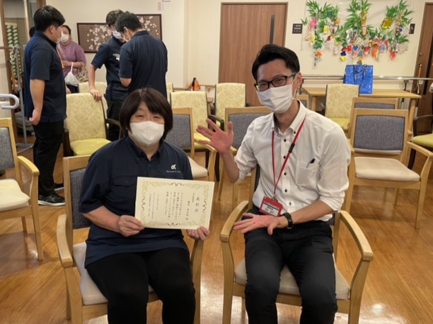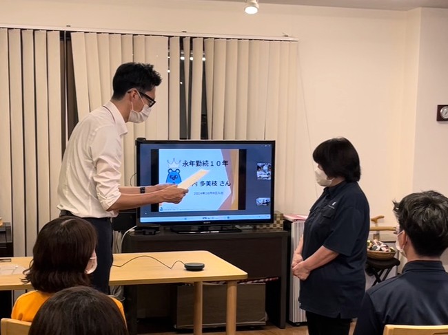 •アルファリビング広島吉島通りのデイサービスでは、看護スタッフのふじうちさんが勤続10年の表彰を受けました。デイサービス開設初期からのメンバーとして、今なお現場を支えてくださっています。