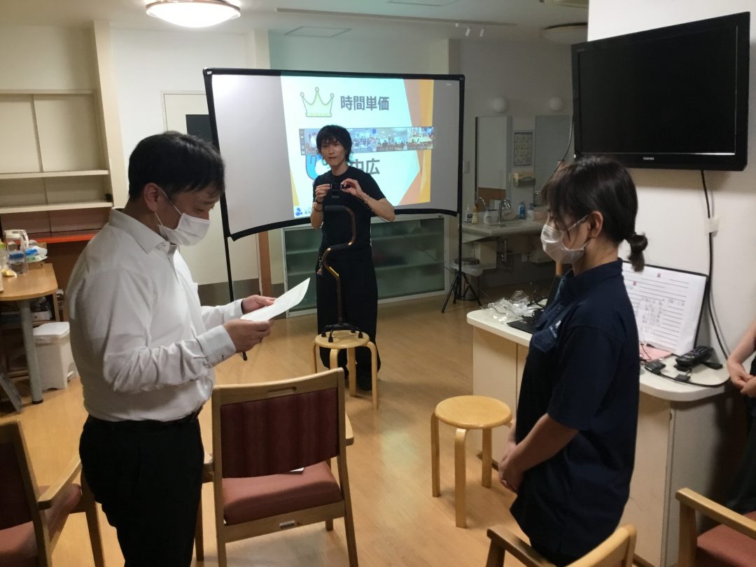 続いて、いとうエリアマネージャーより、エリアの今期の方針が発表されました。司会を務めたのは段原のはなだ施設長です。
