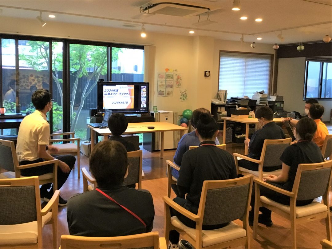 アルファリビング広島中広、広島観音本町、広島吉島通り、広島段原(古江駅前はコロナ感染により残念ながら不参加となりました)の4施設と本社をオンラインでつぎ広島エリアキックオフミーティングが開催されました。