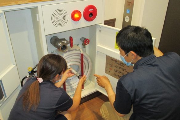訓練は夜間を想定し、スタッフ一人が通報と館内放送する役割、もう一人のスタッフが初期消火と避難誘導する役割に分かれて、