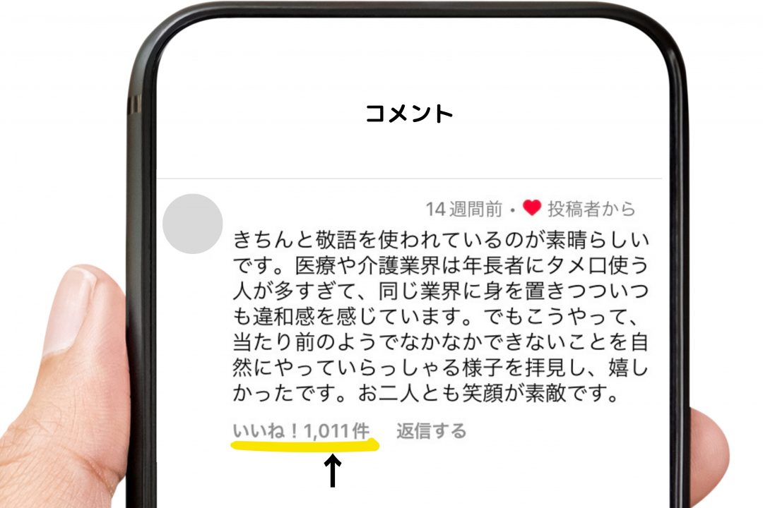 『きちんと敬語を使われているのがすばらしいです。医療や介護業界は年長者にタメ口を使う人が多すぎて、同じ業界に身をおきつつも違和感を感じています。でもこうやって、当たり前のようでなかなかできないことを自然にやっていらっしゃる様子を拝見し、嬉しかったです。お二人とも笑顔が素敵です』
