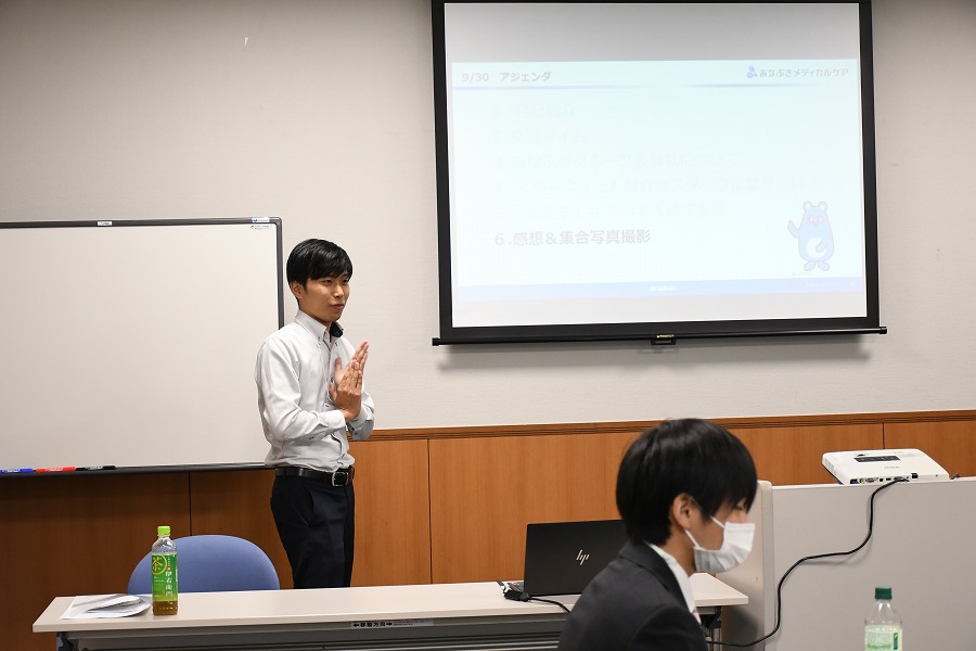 あなぶきグループに属する会社の紹介や、あなぶきメディカルケアの強みを改めて紹介し、入社後の仕事のイメージを持ってもらうために「どんな介護スタッフになりたいか」を考えてもらいました。また、入社してからの研修内容についても説明しました。