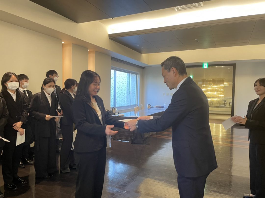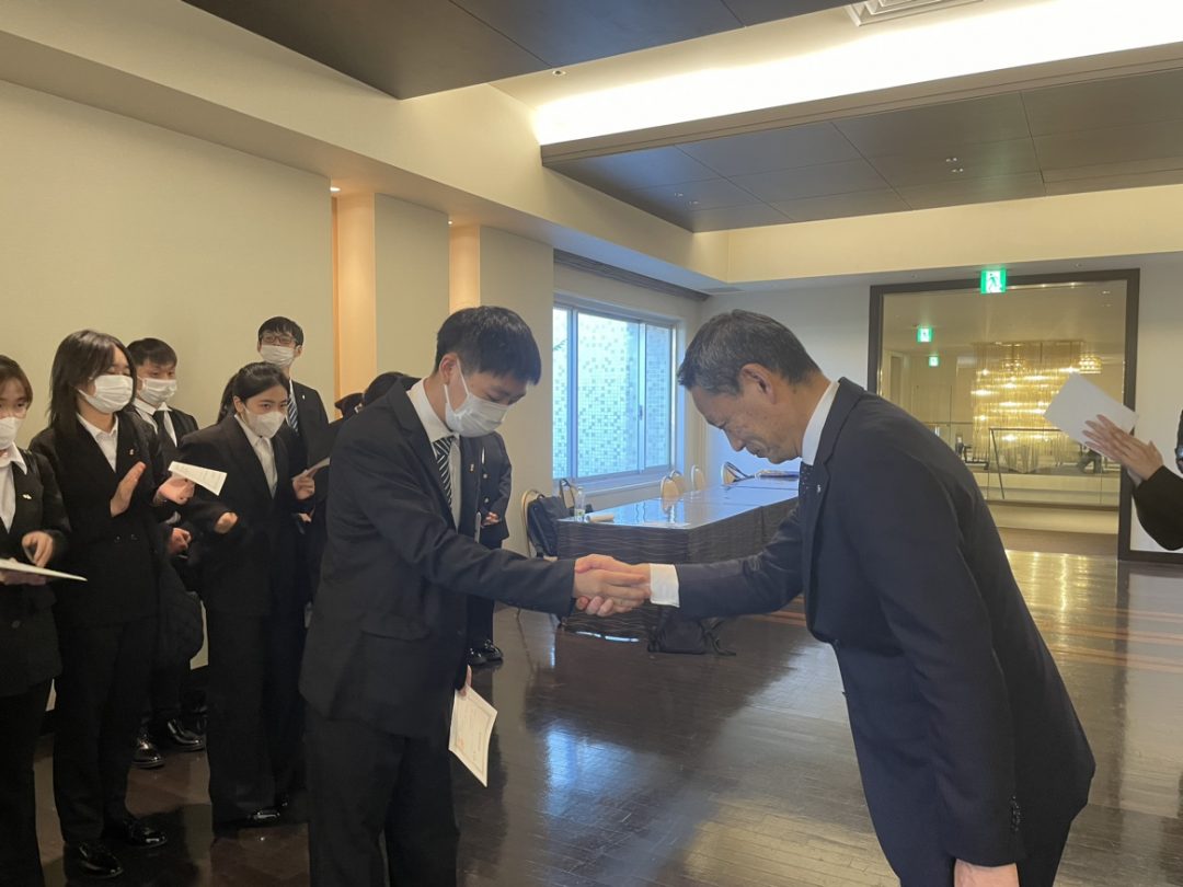 穴吹興産のあなぶき社長からお祝いの言葉をいただいたあと各社に分かれ、おおたに社長より各々に内定証書を授与しました。