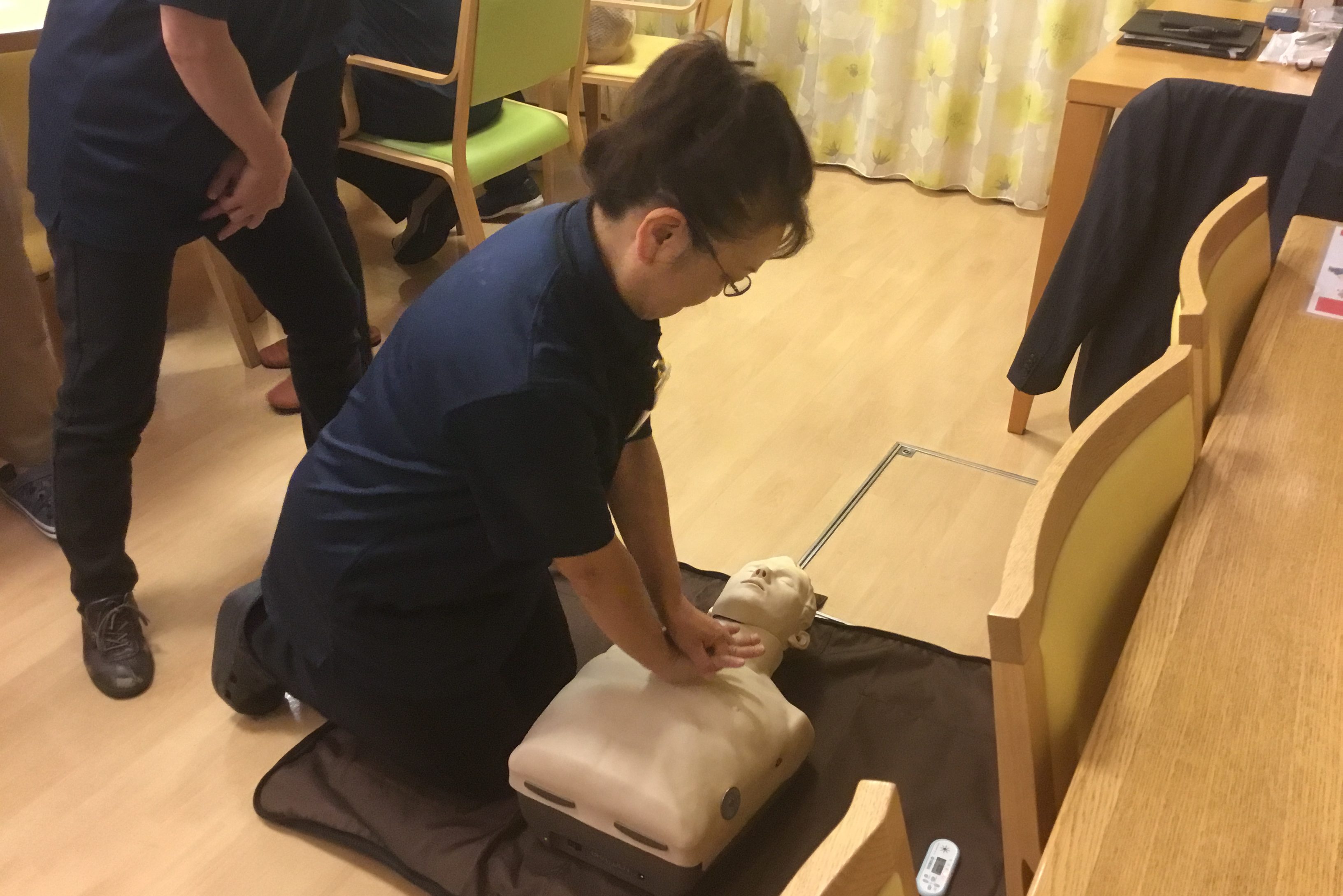 日々、ご入居者の状態に変化が見られるアルファリビングで働くスタッフには、緊急時対応の研修を定期的に行っています。