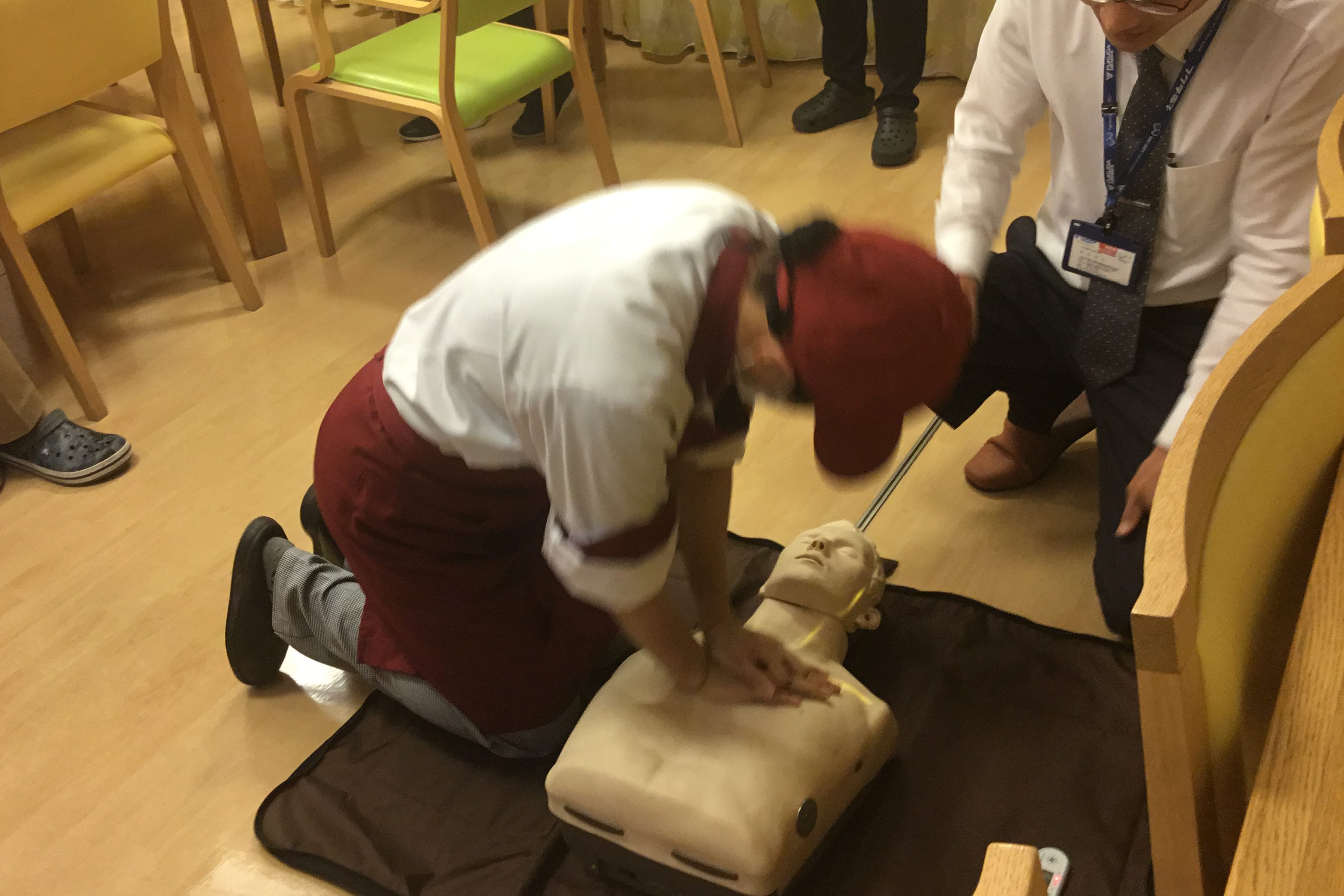 何度も学んでいる内容ではありますが、改めてAEDの取り扱いを学び、胸骨圧迫の手技を復習。厨房のスタッフの皆さんにも参加していただきました。