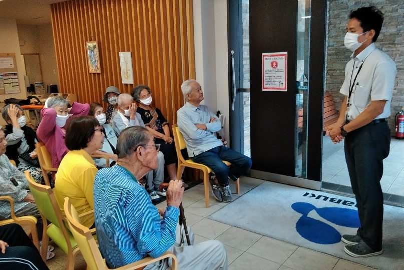 避難訓練の前日までに、ご入居者にもできるだけ多く声を掛け、階段を使用した訓練に参加いただくよう働きかけました。また、階段が使用できない方にも、消火器訓練の様子だけでも見ていただくことで、火災の怖さと初期消火の重要性をお伝えしました。