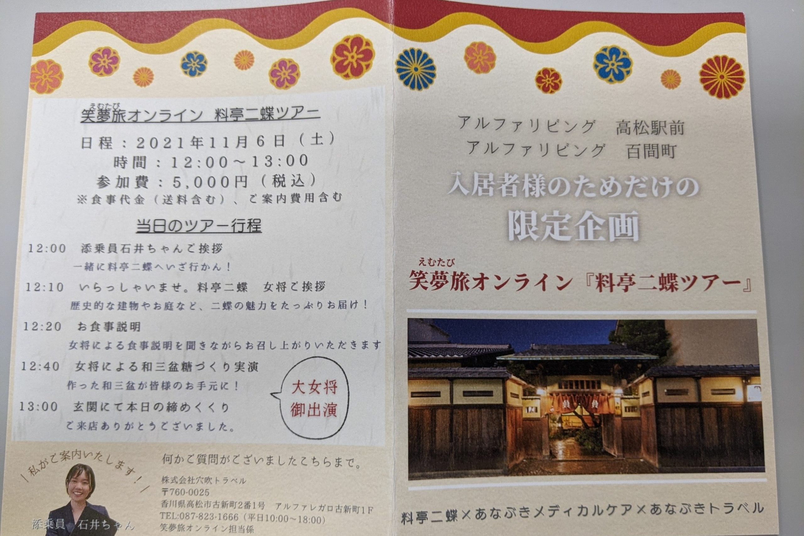 高松市内で有名な料亭【二蝶】と、あなぶきトラベルによるオンラインお食事企画【笑夢旅オンライン 料亭二蝶ツアー】。