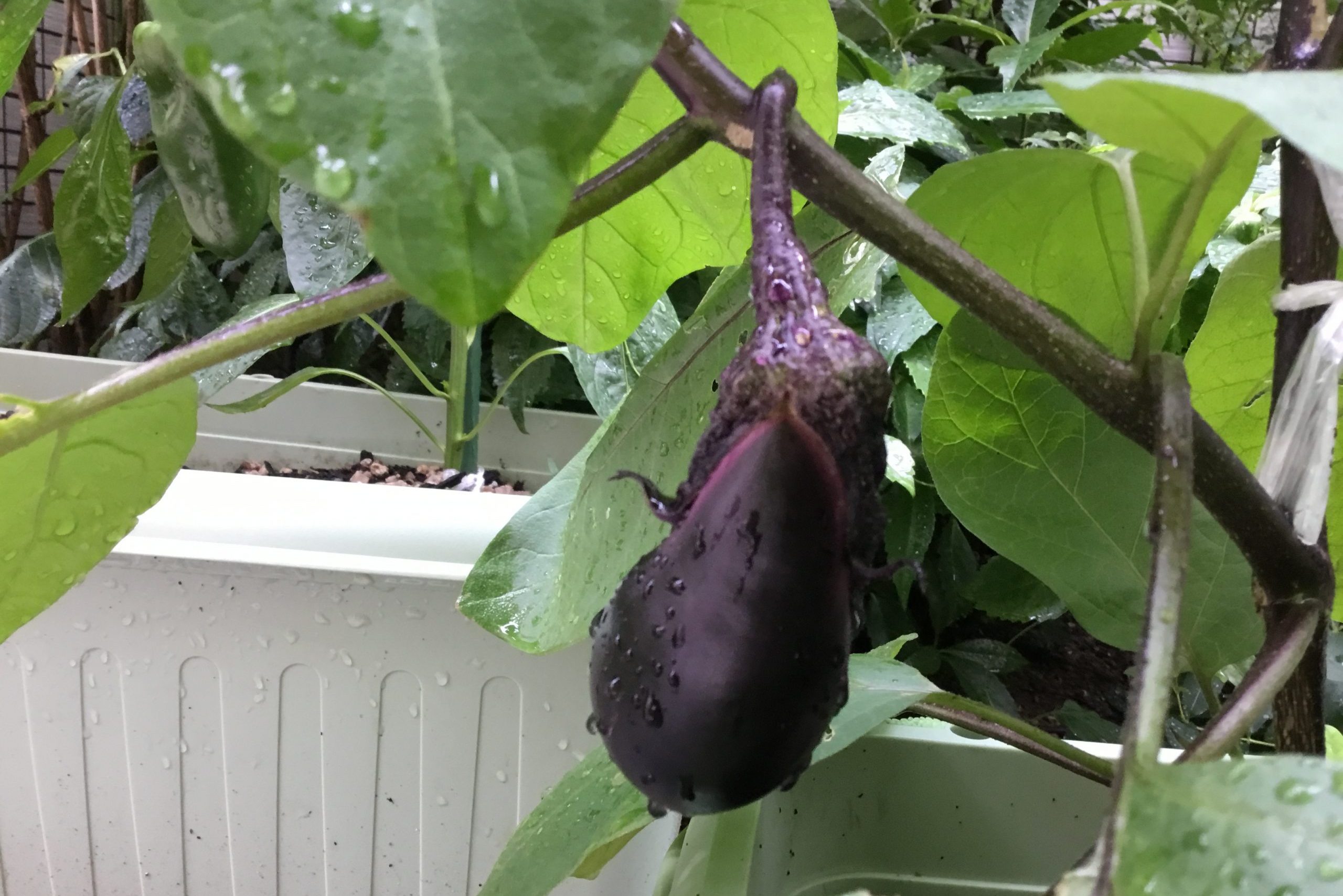 先日、コロコロと丸くキレイな紫色のナスが実りました。