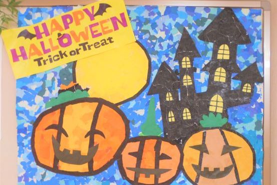 作業では、その時期に合わせたちぎり絵を実施しており。先月はハロウィンの壁飾りを作成しました。