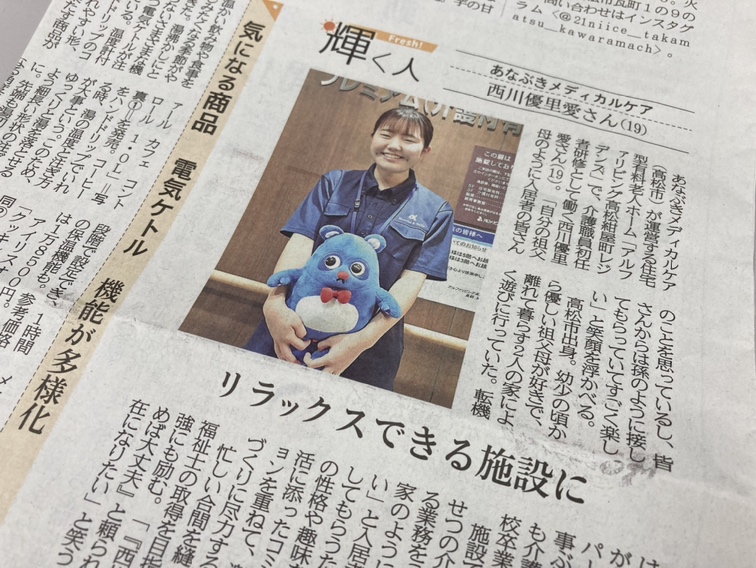 2022年10月16日の四国新聞日曜PLUS+経済「輝く人」に介護スタッフのにしかわさんが掲載されました。