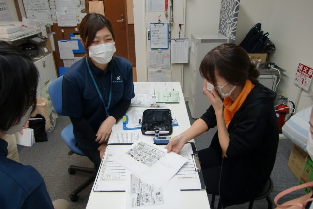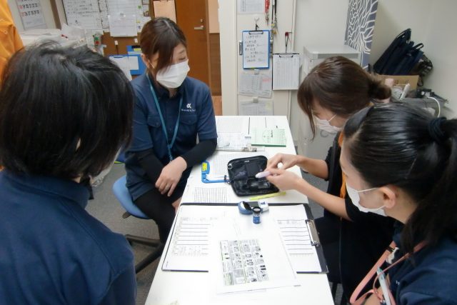 看護スタッフが、血糖測定器・インシュリン注射の方法を介護スタッフへ説明していました。