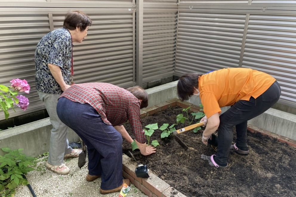 役割がある生活は「生きがい」にも繋がると思い、先日ご入居者の皆さんにお手伝いをいただき、中庭に植物を植えました。