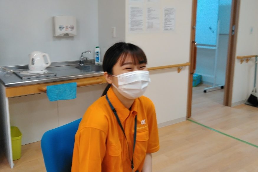 研修中にカメラを向けると笑顔になる、新卒介護スタッフのよこやまさん。