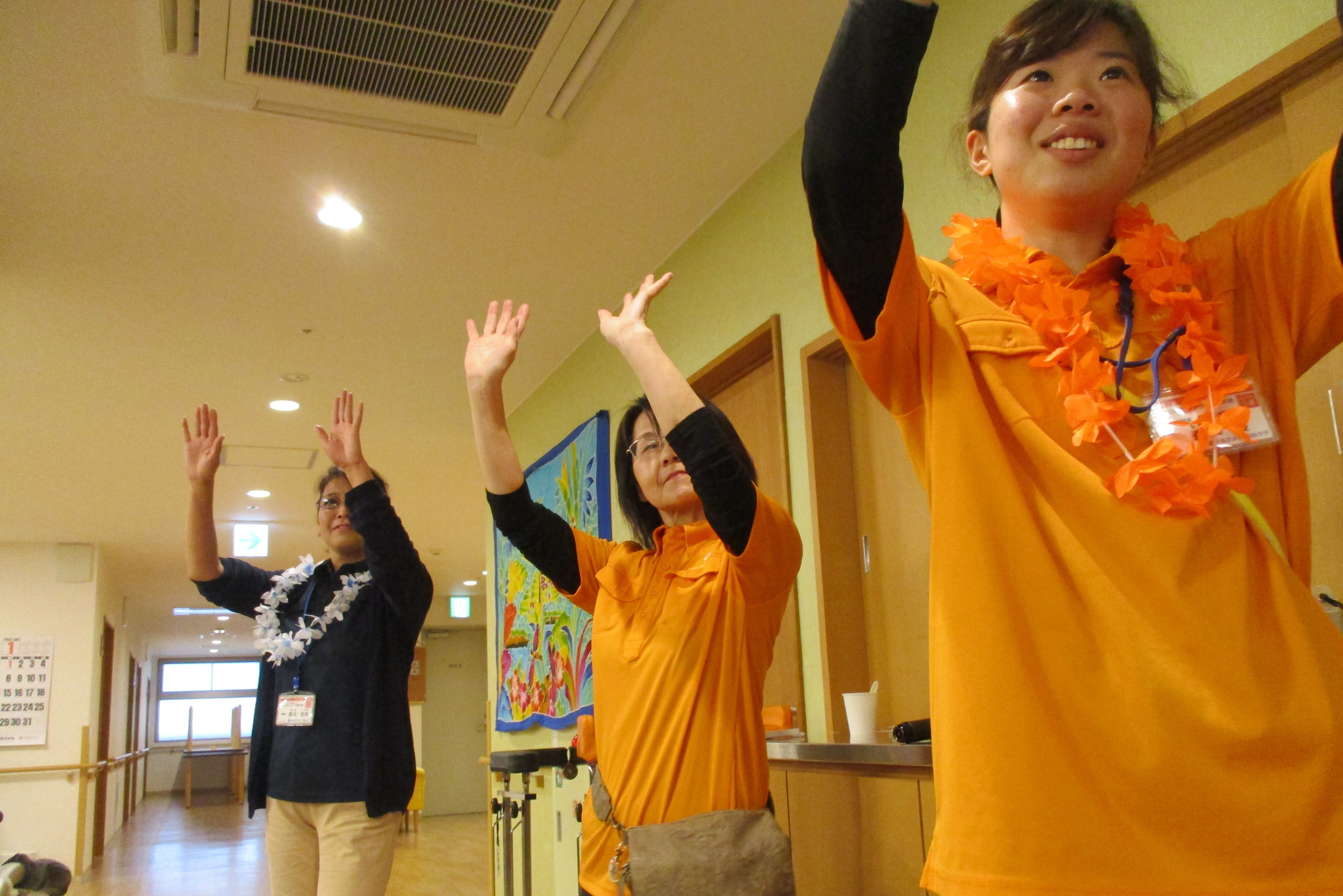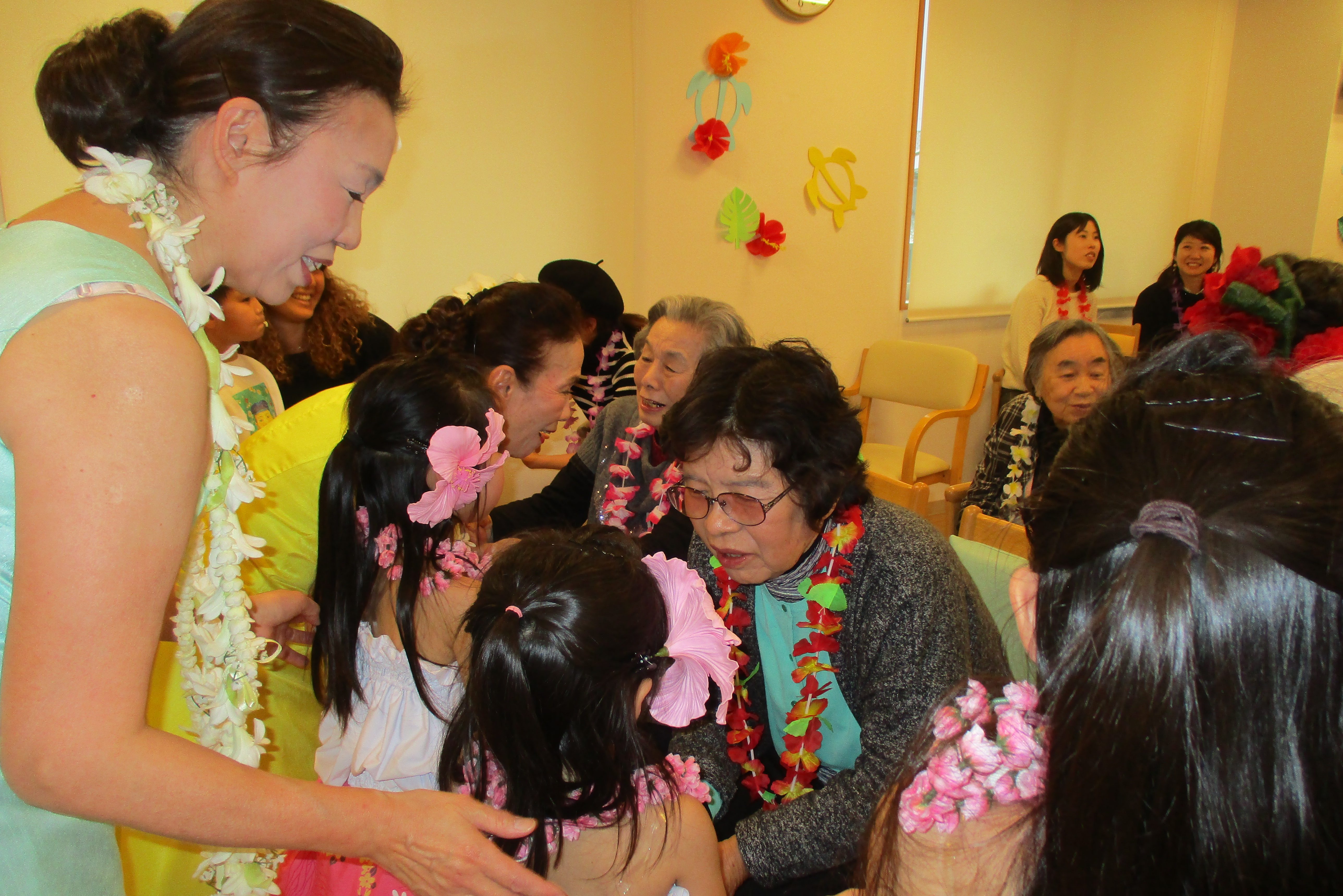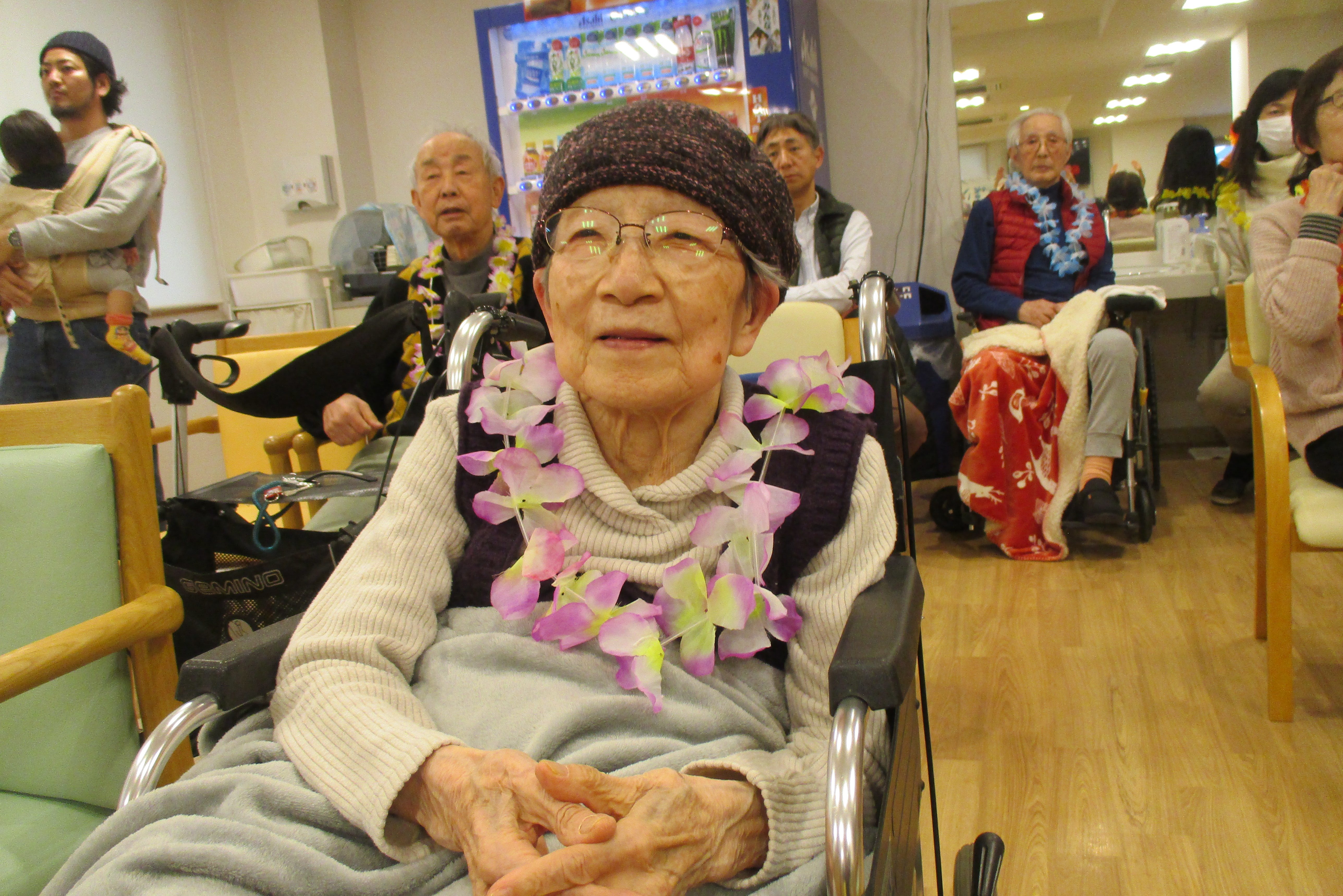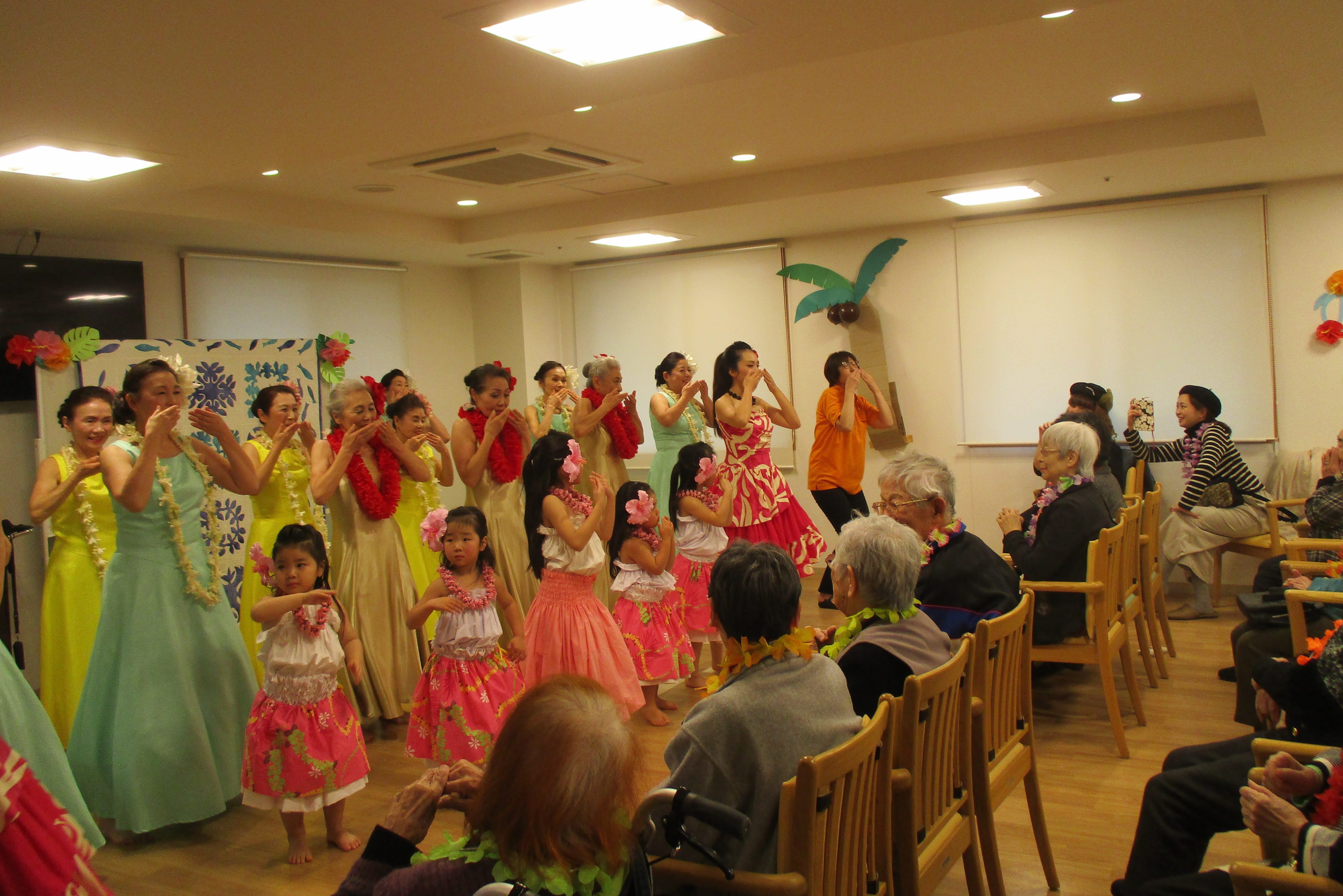 ご入居者の皆さんは首にレイをかけてもらい、本場のフラダンスを見ているような気分になり、一緒に簡単な振りをしたり、ちびっ子フラダンサーの可愛い踊りを見て楽しい時間になりました。