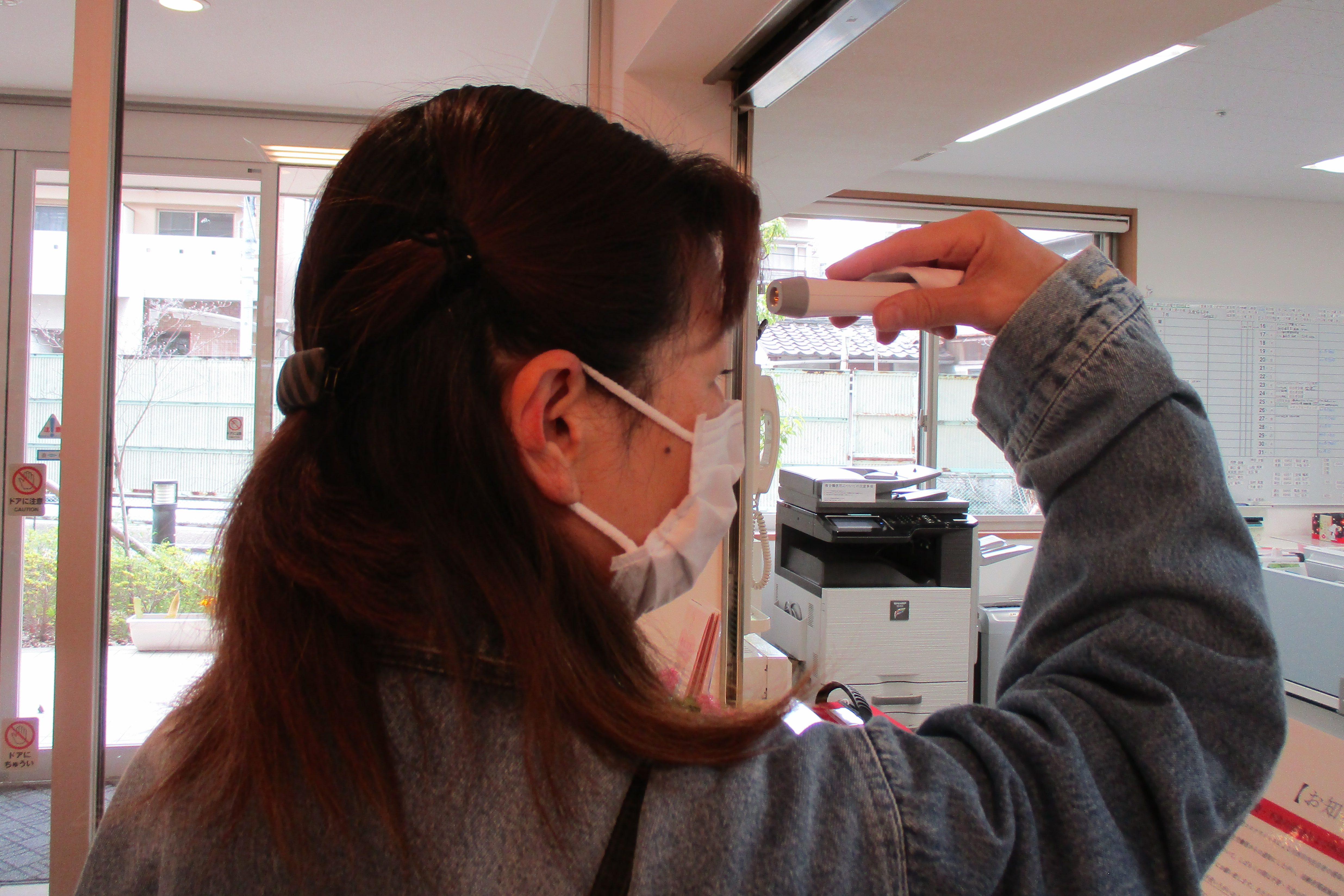 受付に【お知らせ】のポスターを置き、事務所にいるスタッフ立ち合いの元、検温、うがい、手洗い、手の消毒そして上着を脱ぎ、裏返しにして畳んでいただく事をお願いしています。