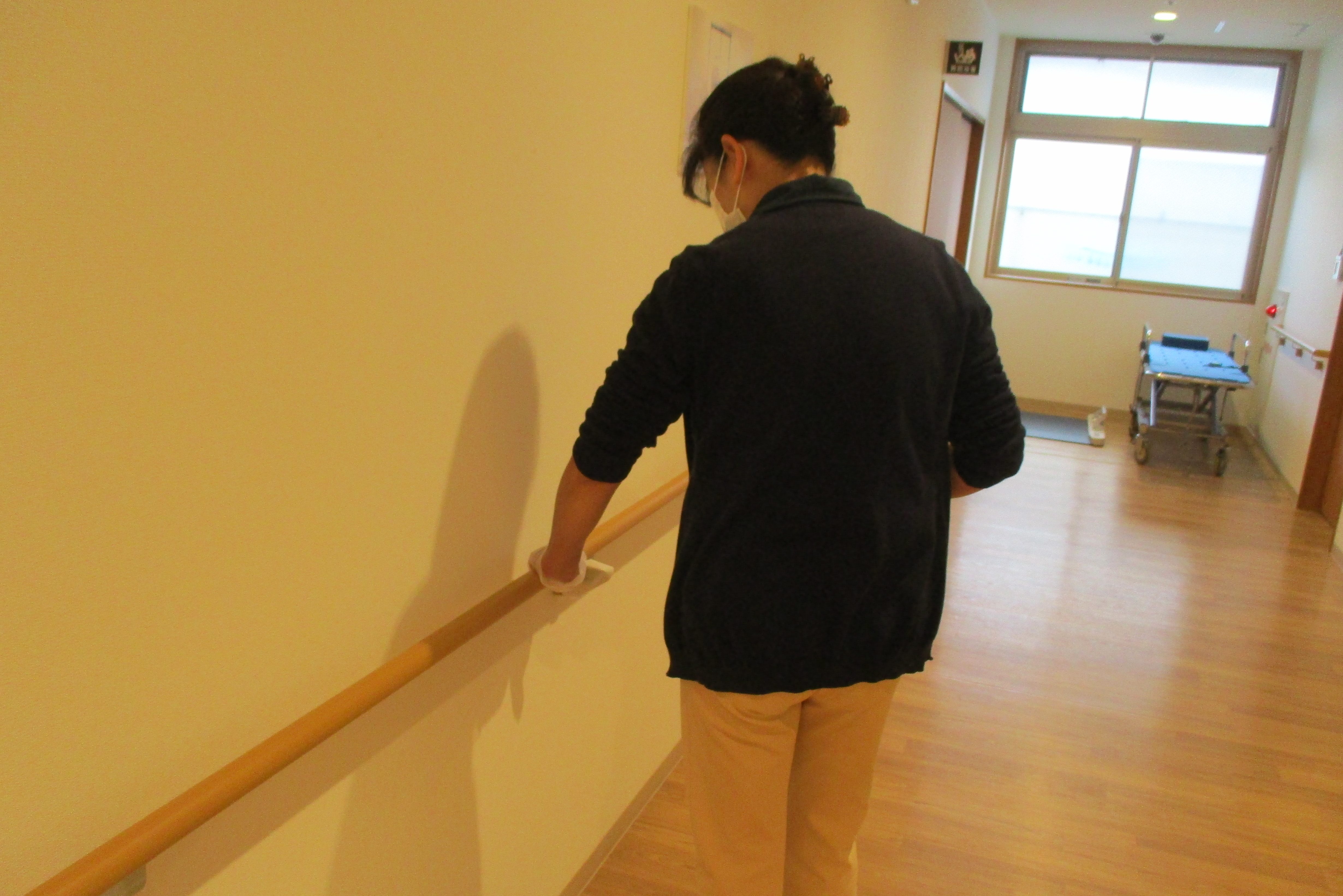 館内の手摺り等もこまめに消毒をしています。換気も時間を決めて実施しています。